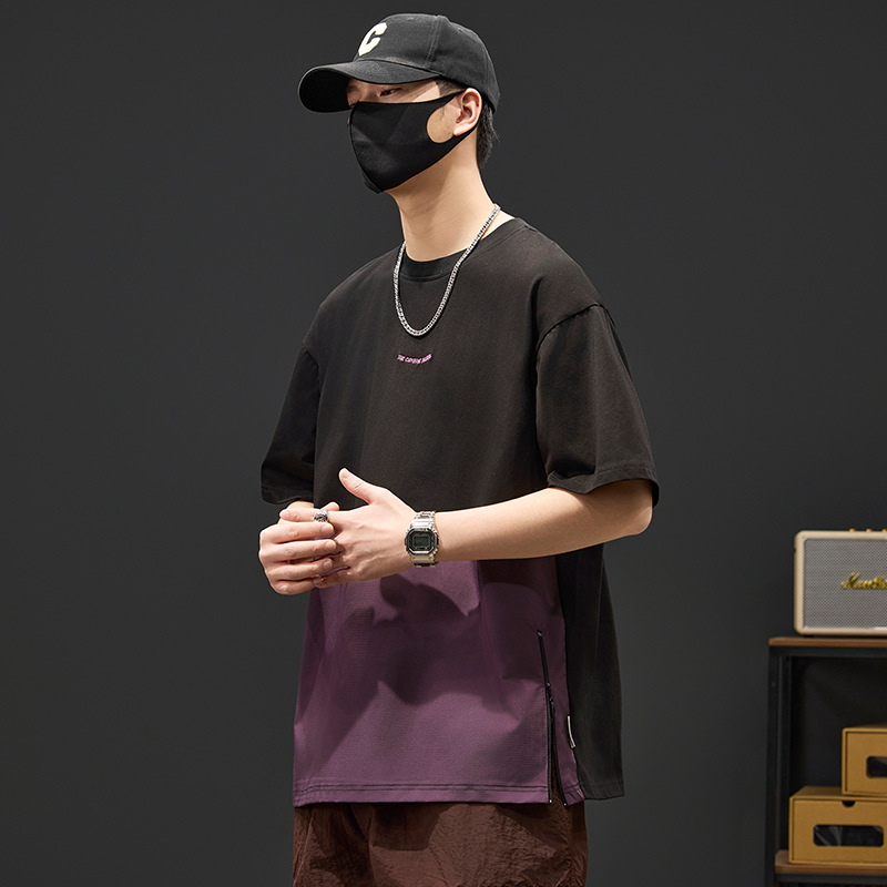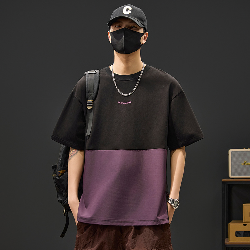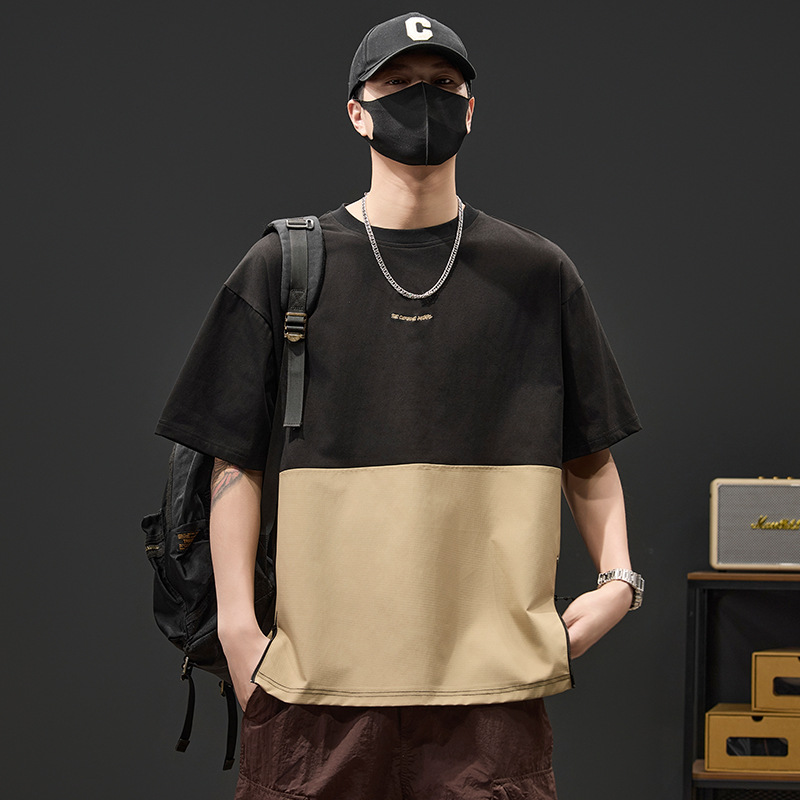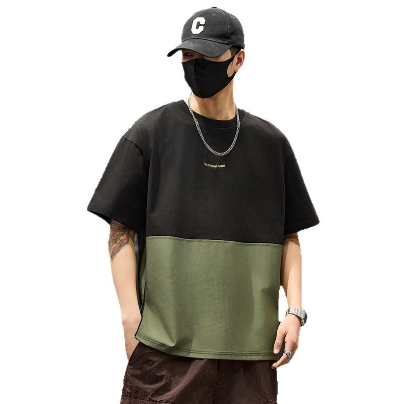撞色拼接设计感工装短袖男日系复古宽松大码胖子口袋休闲圆领跨境