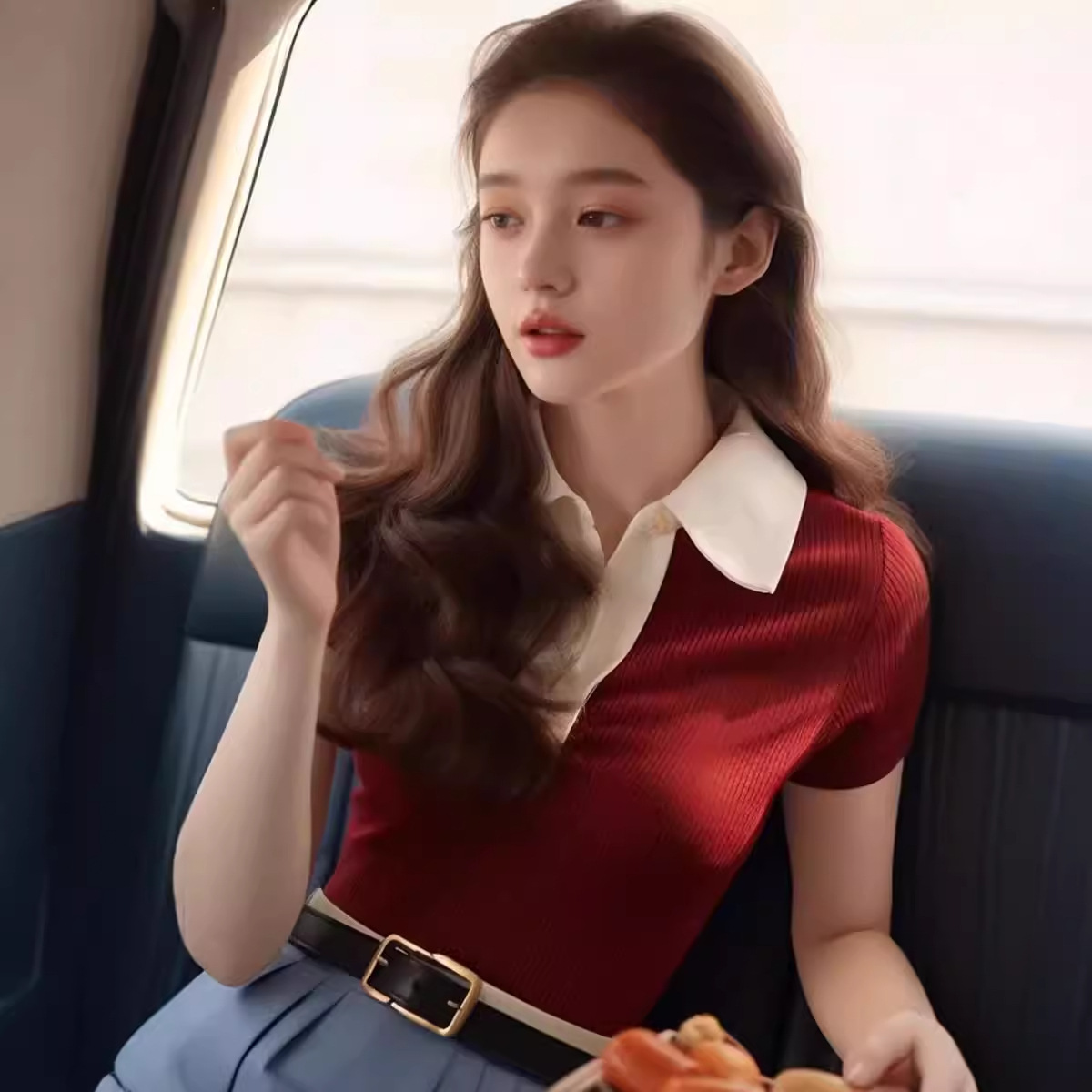 夏季法式独特别致冰丝针织上衣高级设计感polo领多巴胺短袖t恤女