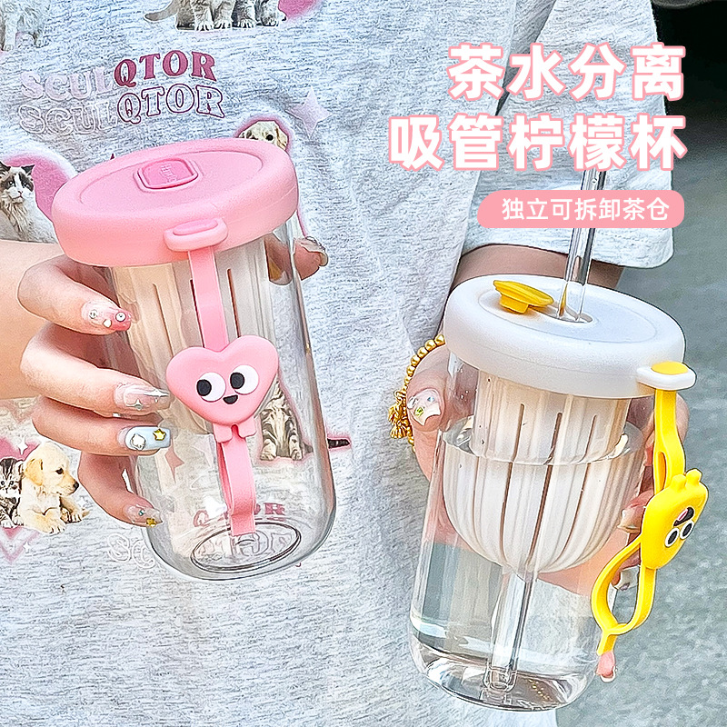 夏季新款高颜值耐高温防摔塑料杯茶水分离学生吸管杯便携提手水杯