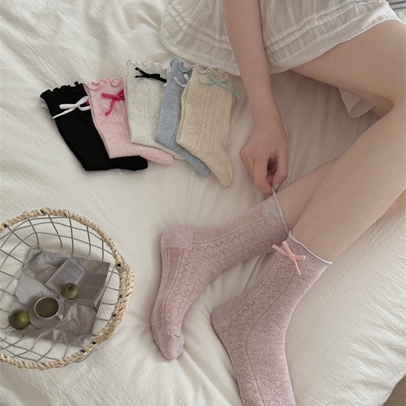 日系甜美百搭夏季新品高弹棉木耳边爱心镂空马卡龙色蝴蝶结薄短袜