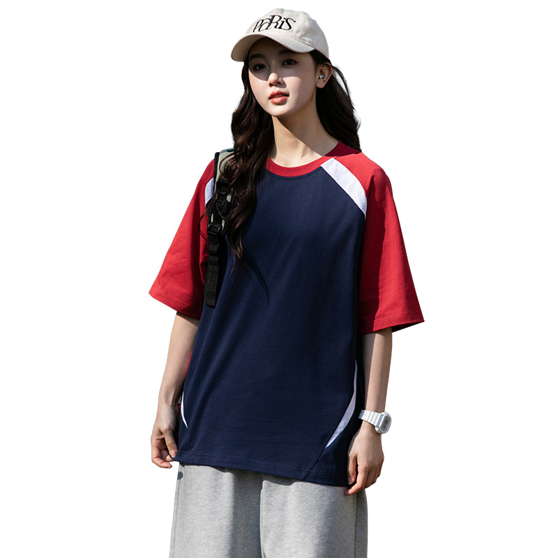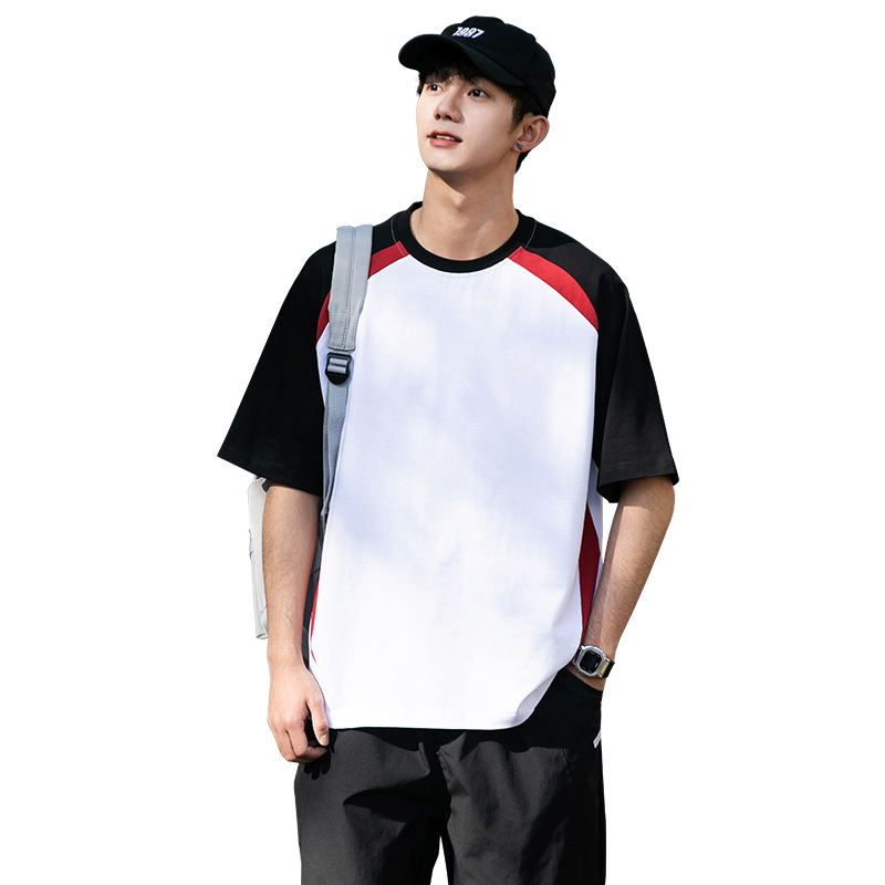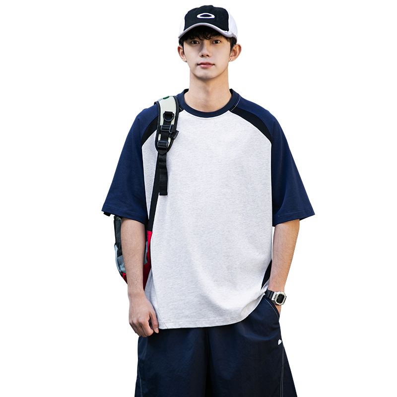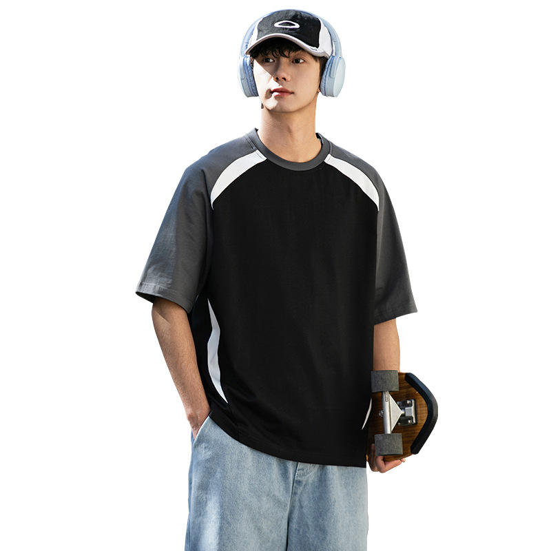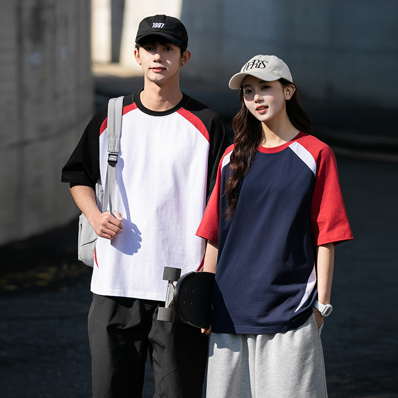 美式重磅插肩袖t恤男女 纯棉短袖拼色落肩圆领宽松休闲体恤上衣夏