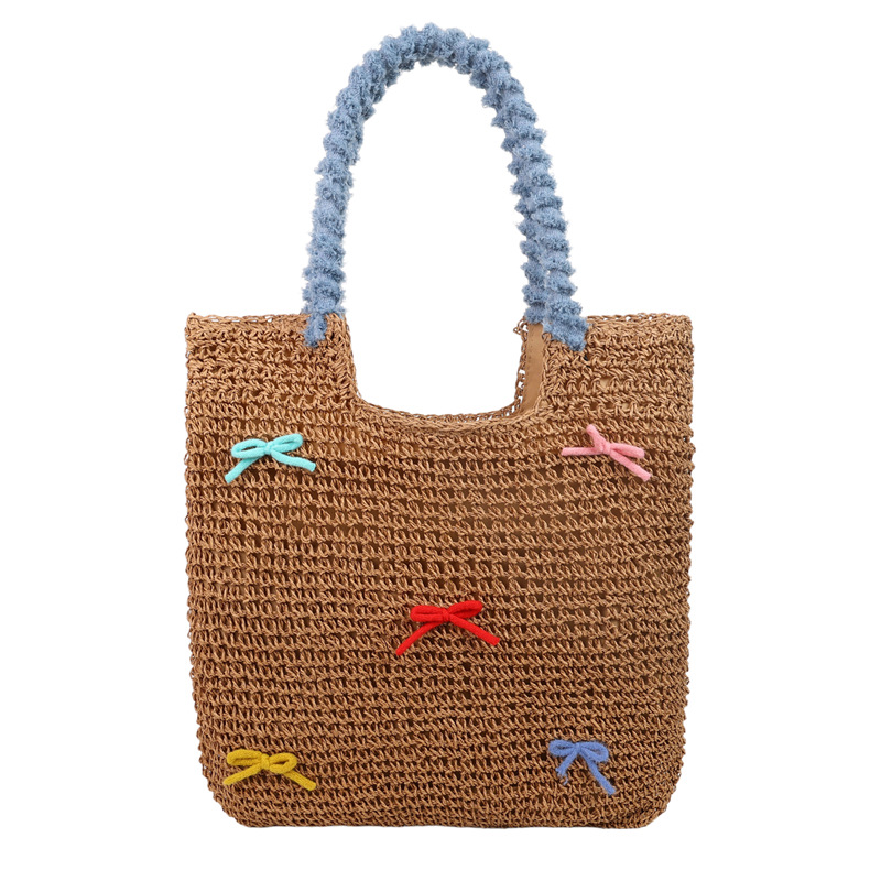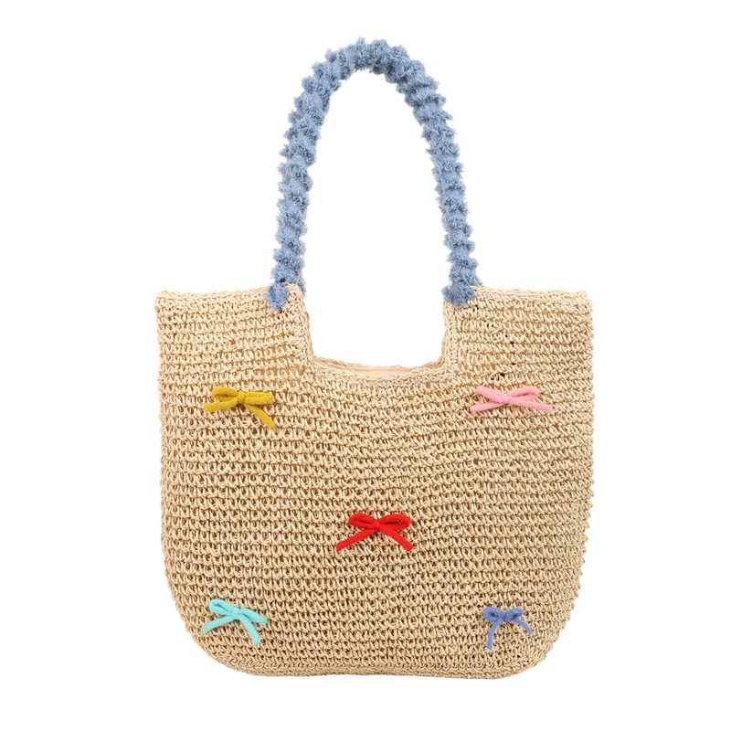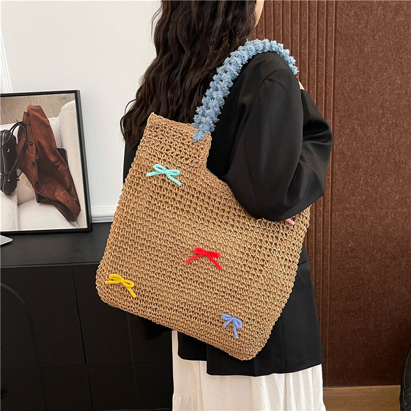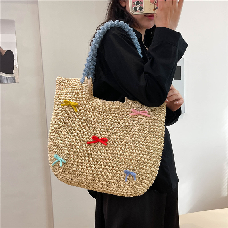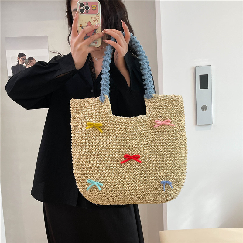 新款手工编织包可爱蝴蝶结沙滩包时尚休闲单肩草编托特包度假风包