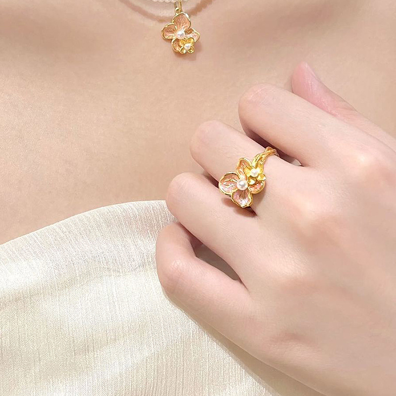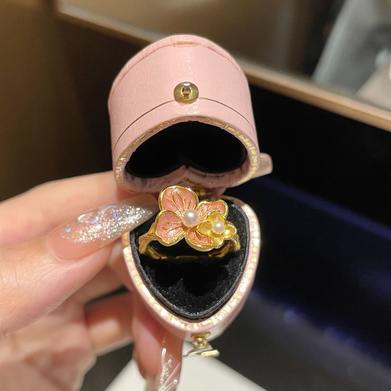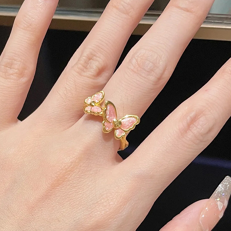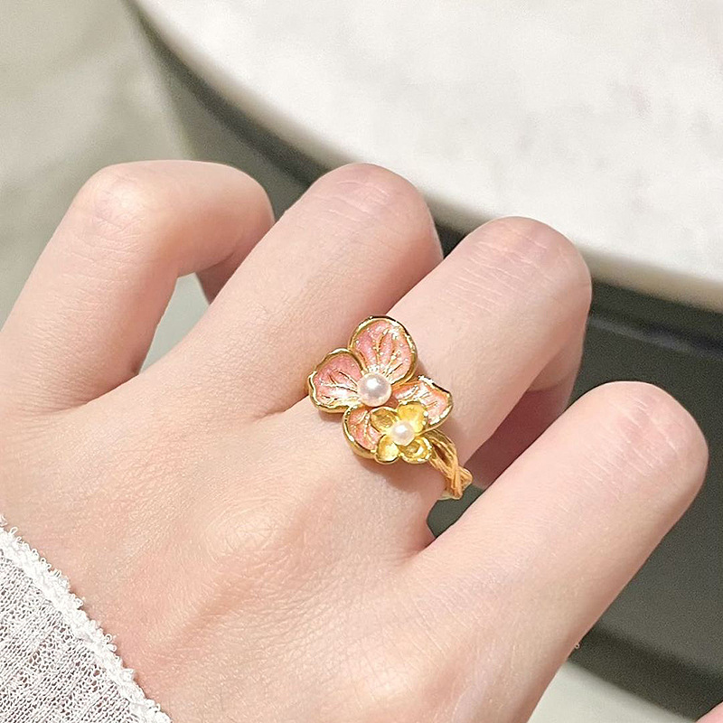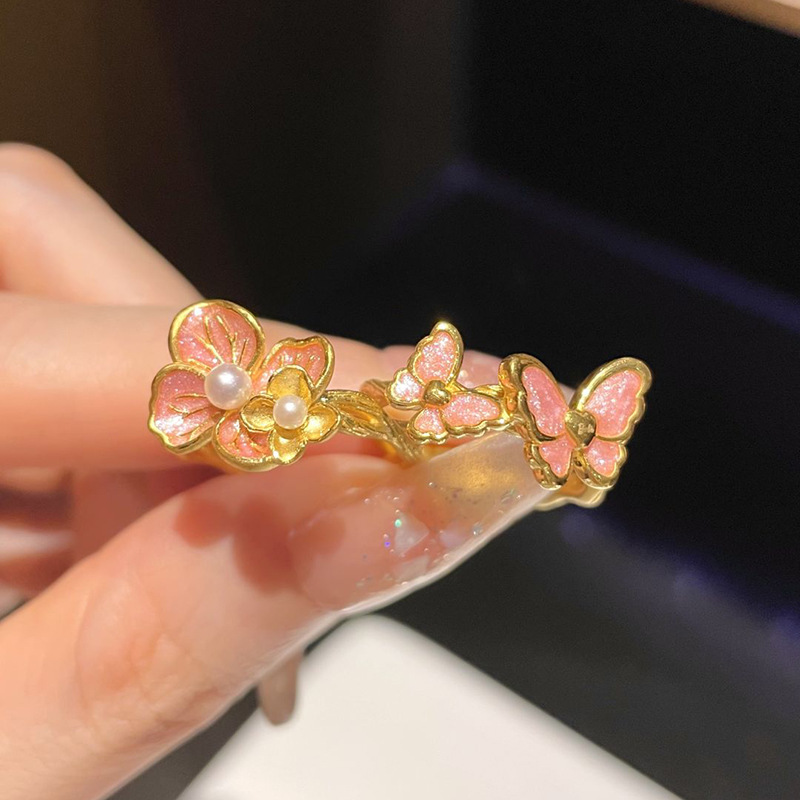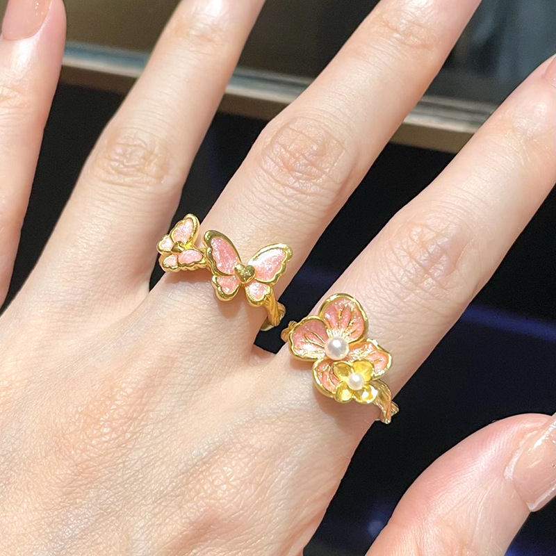 小红书爆款芭比公主舞蝶粉金色珐琅戒指女凡尔赛珠光绣球花指环