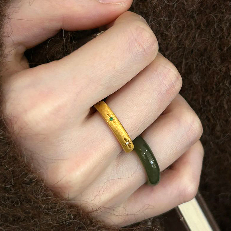 小红书爆款拉丝六芒星戒指中古老钱风绿钻八芒星叠戴指环一件代发