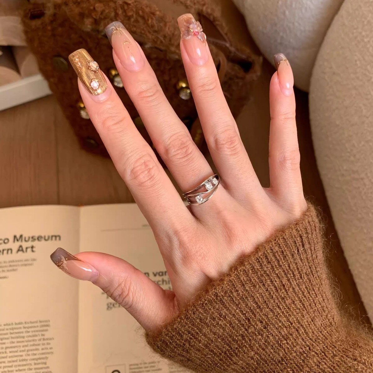 纯手工美甲穿戴甲指甲贴裸色纯欲风珍珠爆闪钻奶白法式学生可拆卸