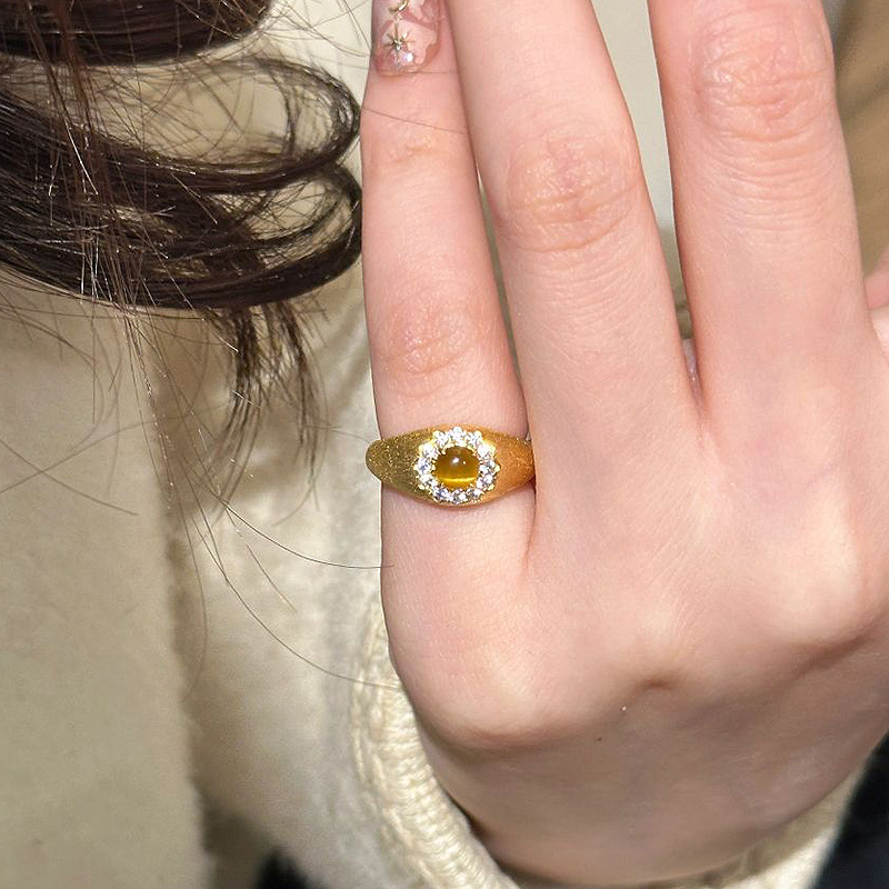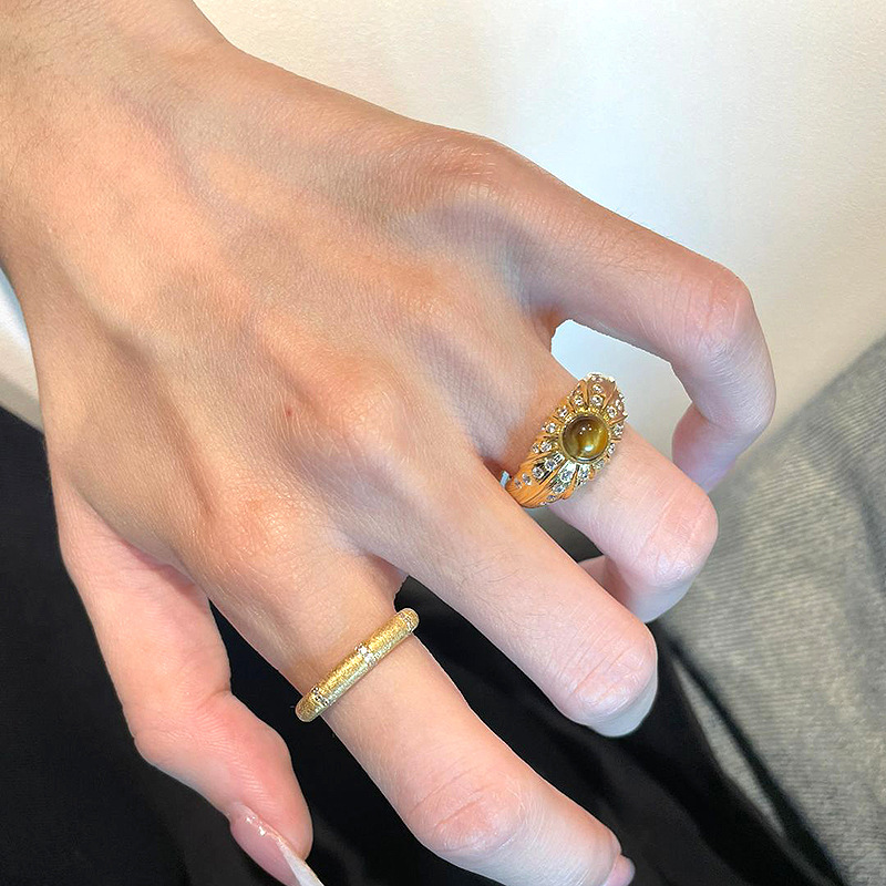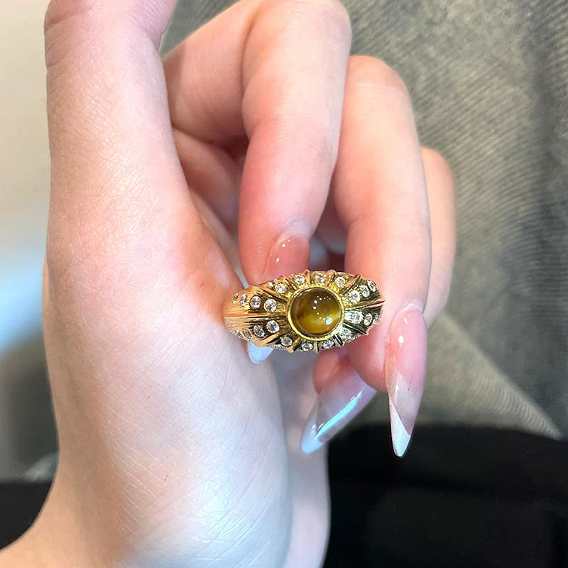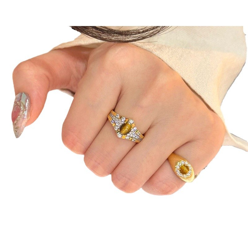 小红书爆款满钻虎眼石复古戒指中古风拉丝工艺尾戒摩卡美拉德指环