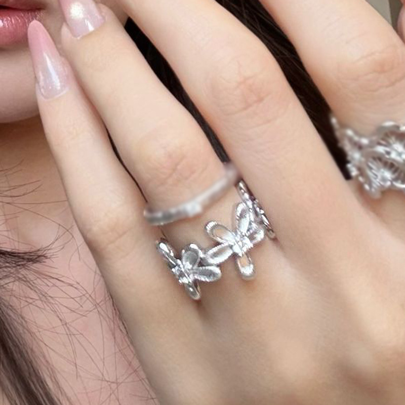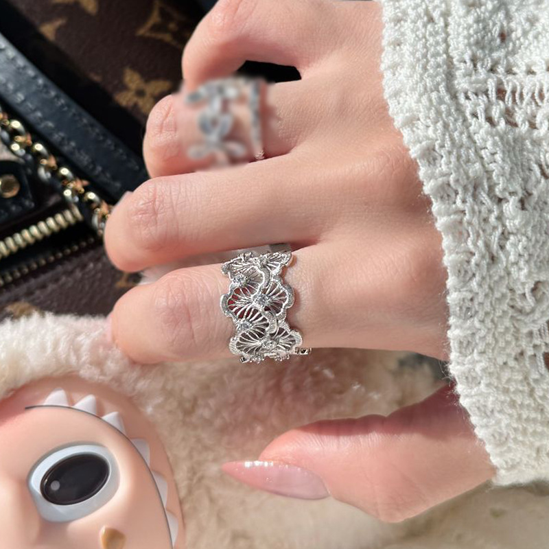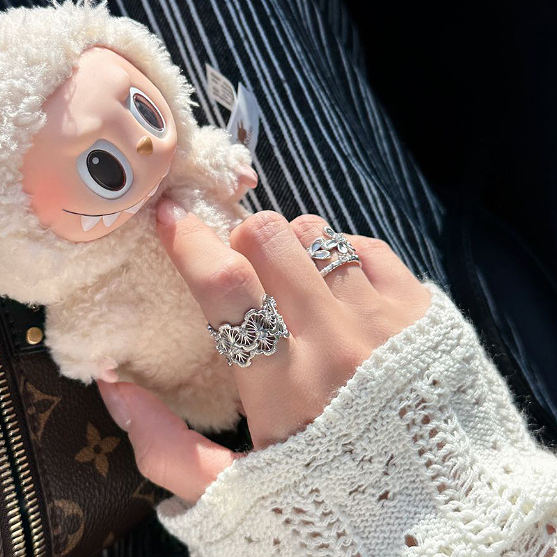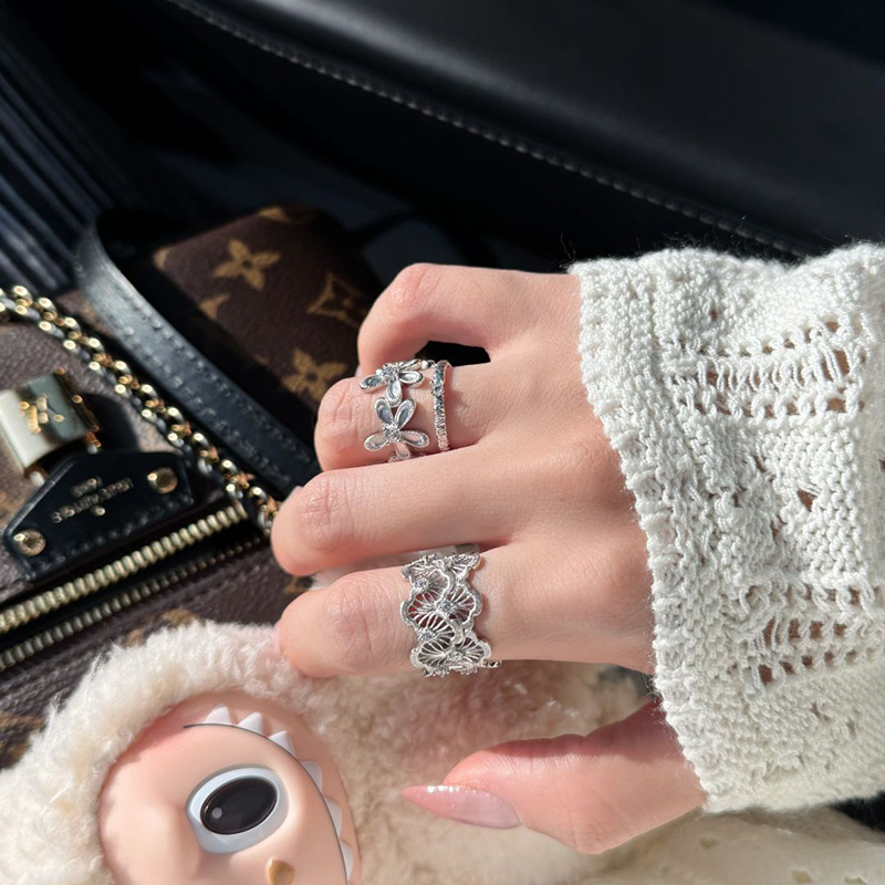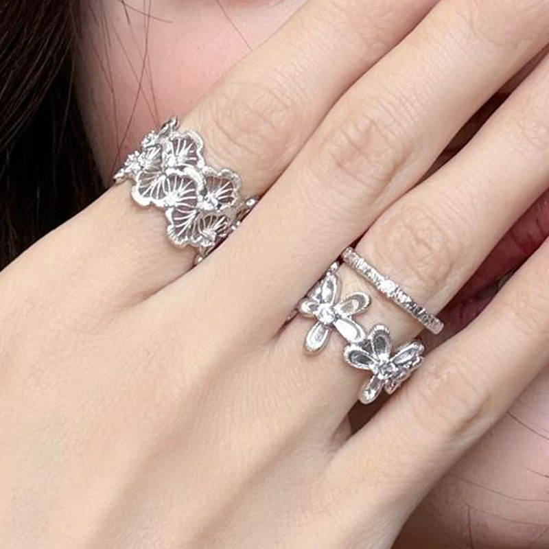 小红书爆款拉丝小花戒指时尚韩版银色蕾丝镂空叠戴指环一件代发