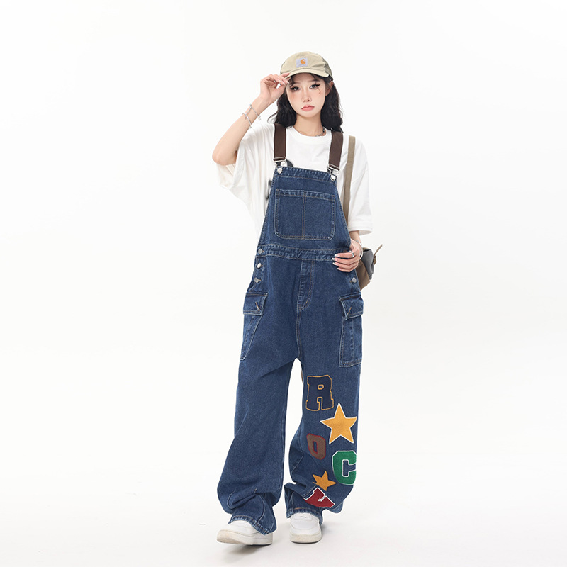 春夏新款美式复古毛巾绣牛仔背带裤女春夏新款宽松休闲连体裤