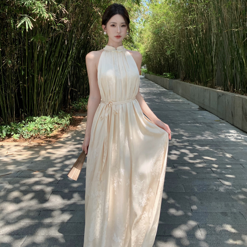 重工提花改良新中式宽松度假连衣裙珍珠盘扣挂脖裙女青春感海岛裙