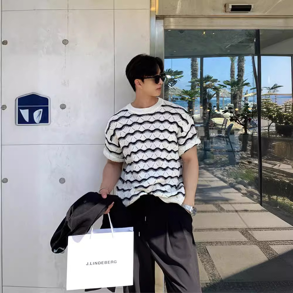 针织圆领短袖T恤男士新款黑白条纹体恤痞帅百搭休闲潮流上衣