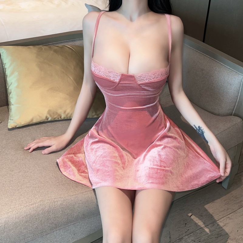 性感辣妹纯欲粉色丝绒吊带低胸蕾丝短裙收腰显瘦大摆a字连衣裙女