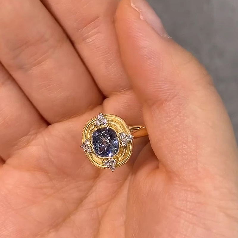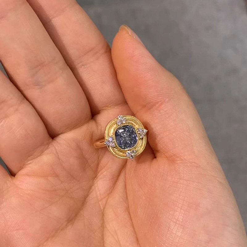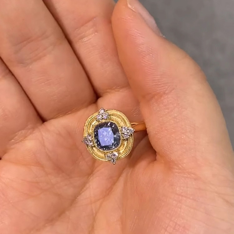 小红书同款vinatger中古蓝宝石点钻爆闪方糖戒指古法金色气质指环