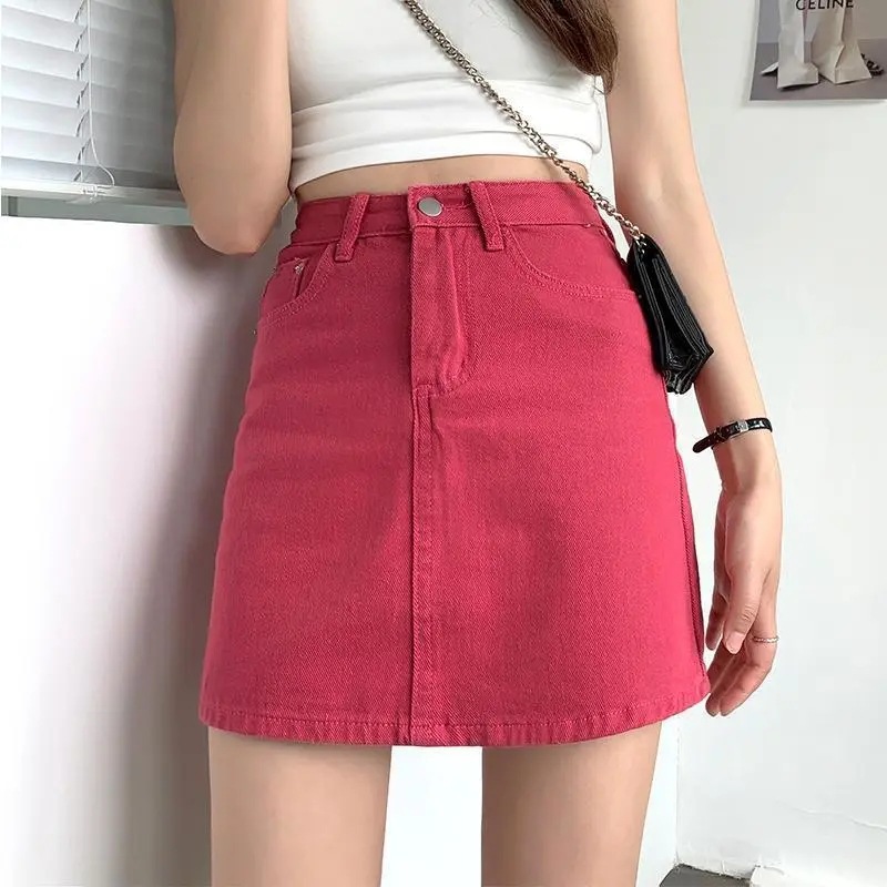 日系减龄女团夏玫红色短裙女牛仔半身裙百搭甜辣风包臀裙显瘦ins