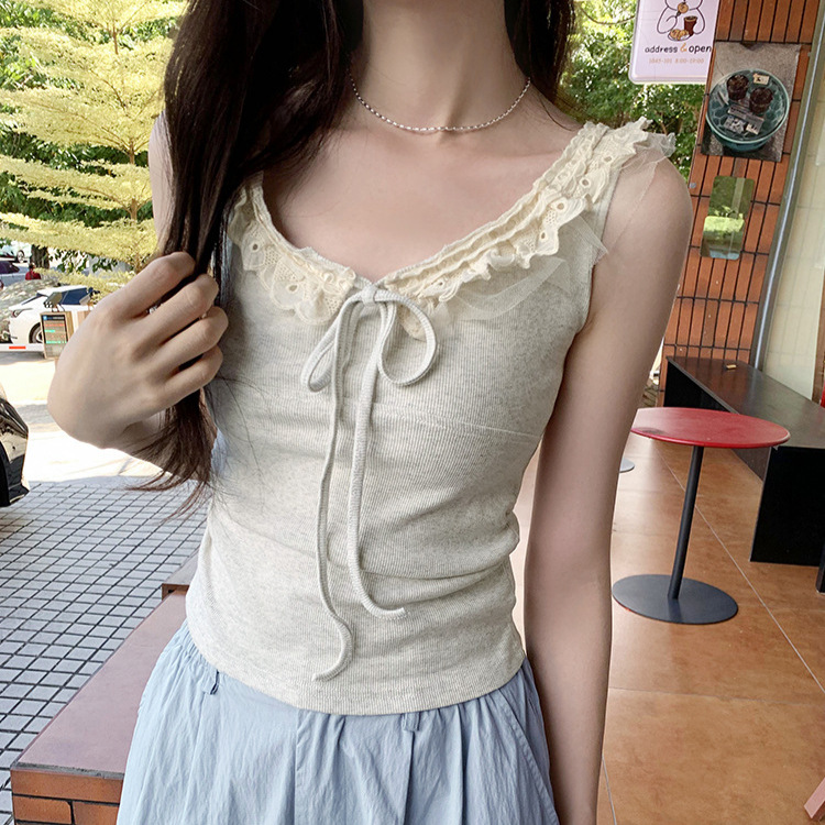法式设计感蕾丝边系带背心女夏甜辣小众收腰抽褶显瘦上衣