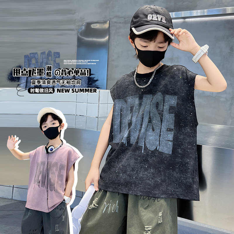 夏季新款大男童字母背心童装儿童男孩泼墨无袖背心个性潮酷百搭
