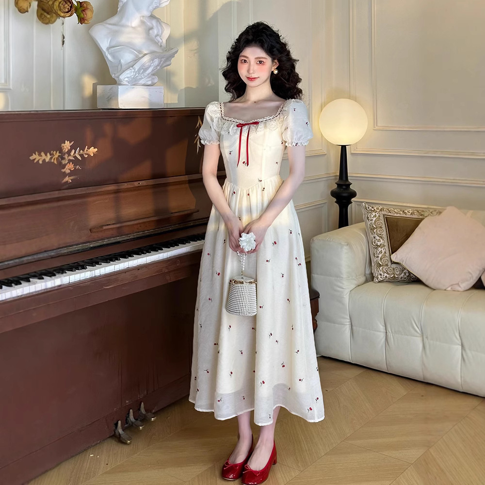 法式泡泡袖方领公主裙刺绣碎花裙夏季复古气质收腰连衣裙SS