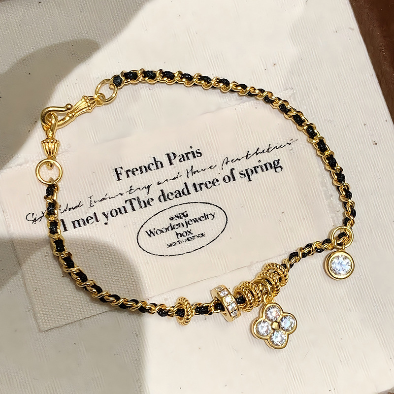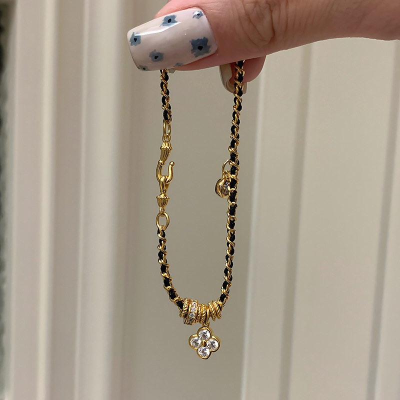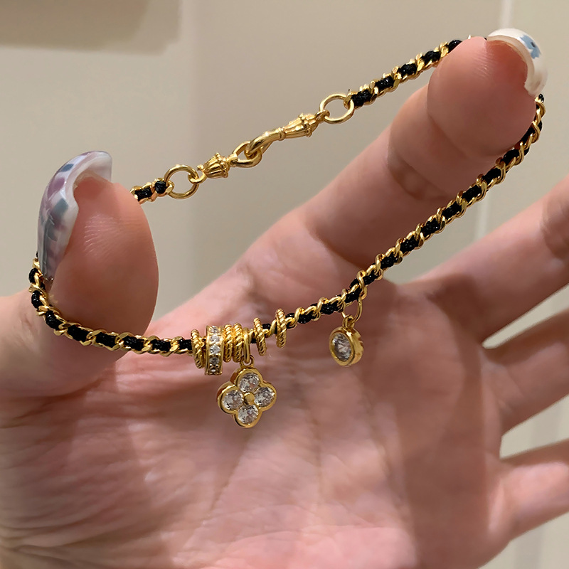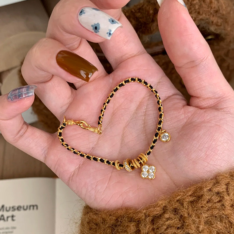 小红书同款新中式国潮点钻四叶花黑金手链小众百搭高级感编织手链