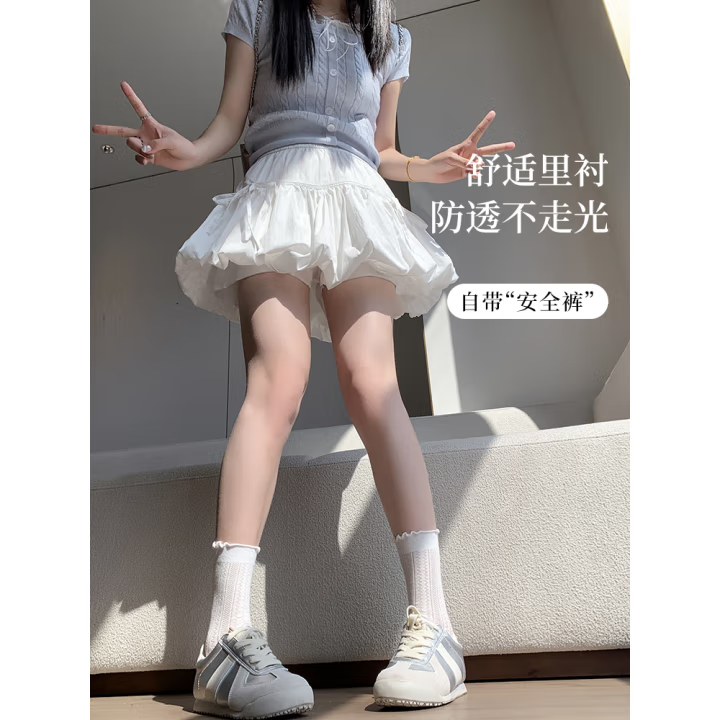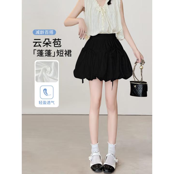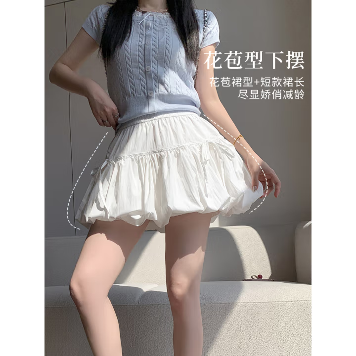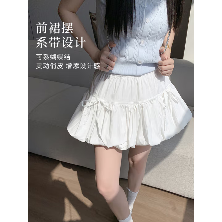 白色花苞短裙女夏款防走光高腰云朵蓬蓬裙A字蝴蝶结半身裙女