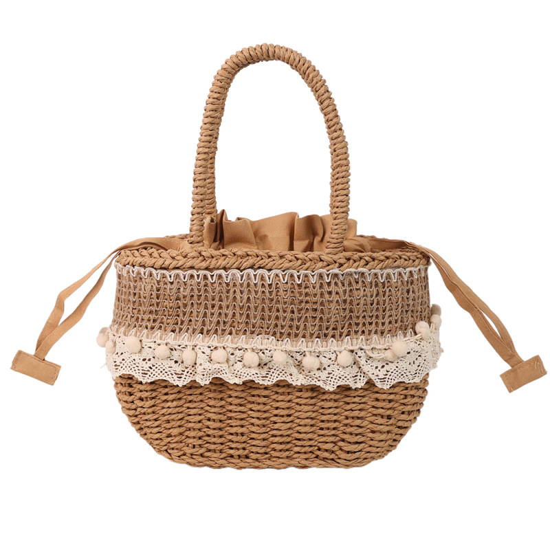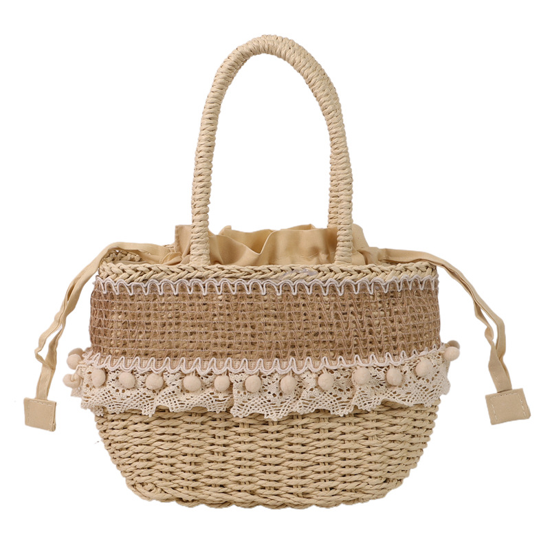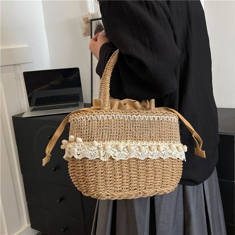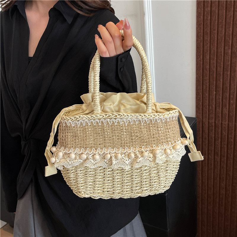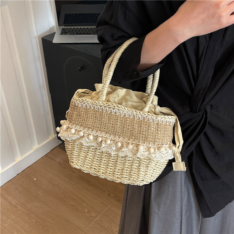 度假沙滩草编包包女2025新款百搭仙女蕾丝手提包抽带大容量编织包