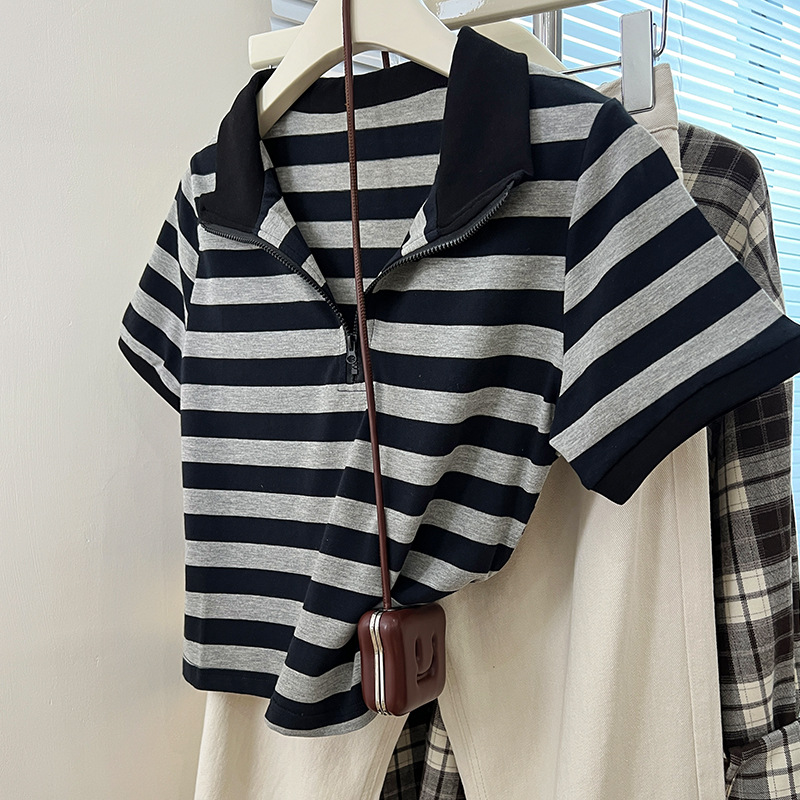 正肩polo衫条纹短袖t恤女夏季短款拉链辣妹上衣设计感