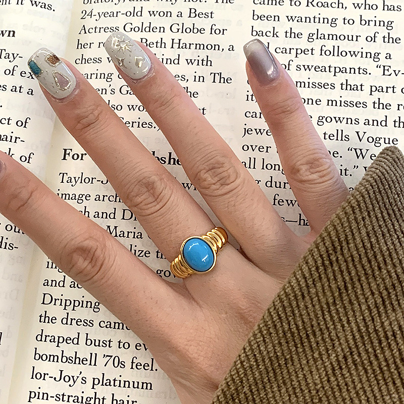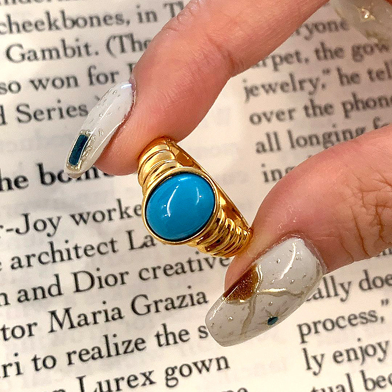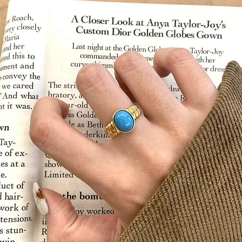 小红书爆款绿松石戒指女中古风光面彩宝指环时尚条纹设计