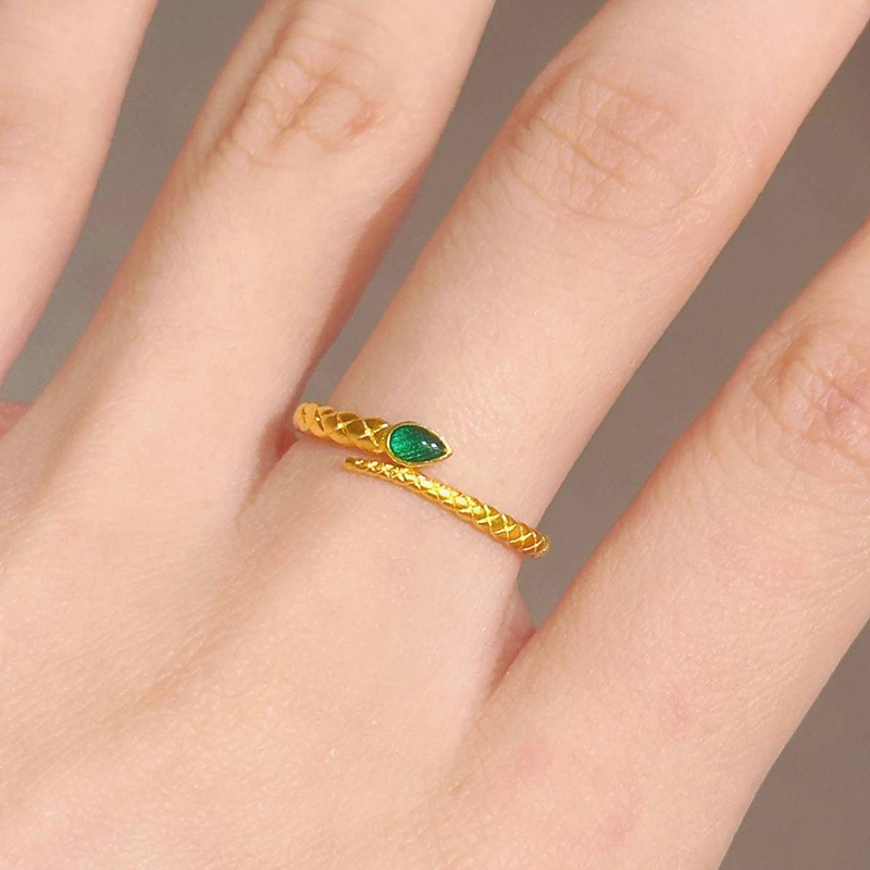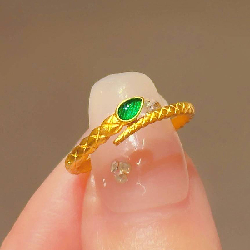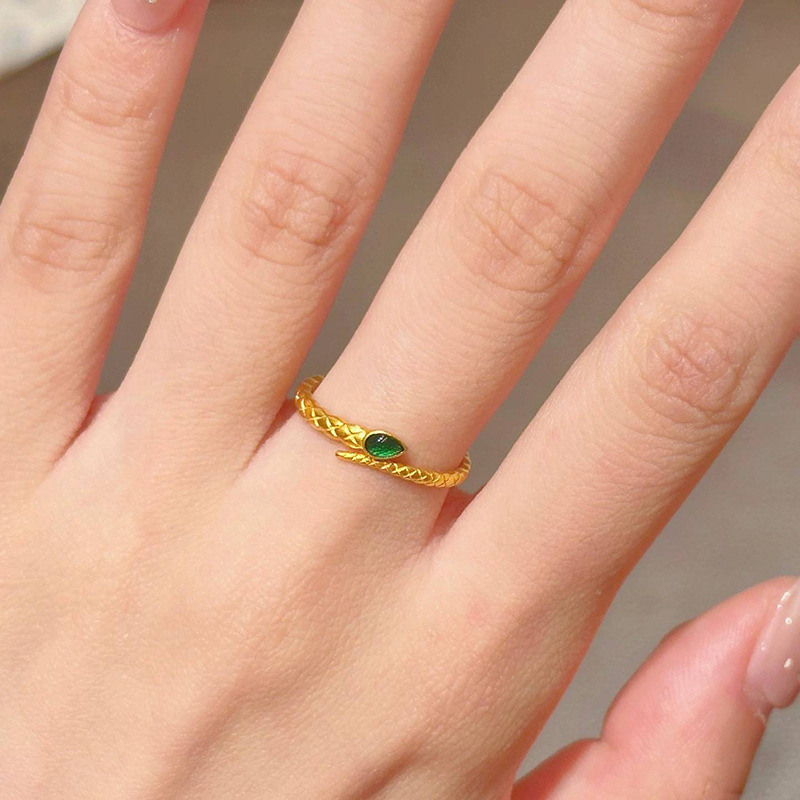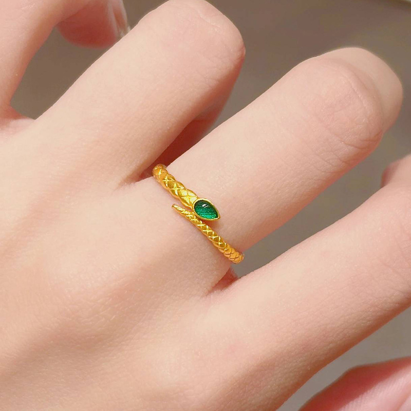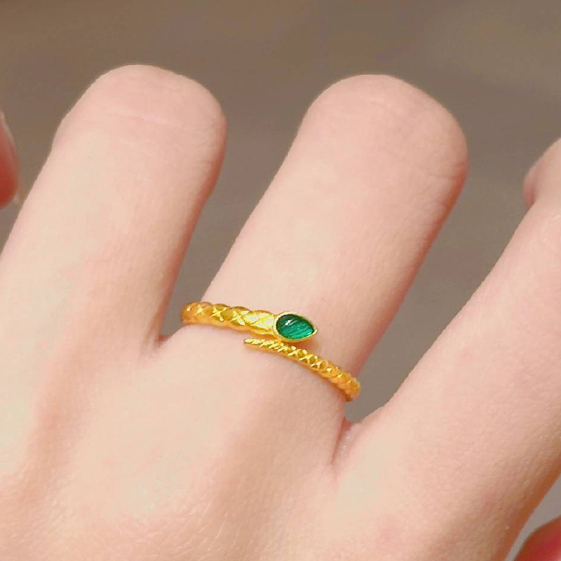 小红书爆款绿宝灵蛇戒指古法重工条纹蛇镶嵌宝石生肖蛇可调节指环