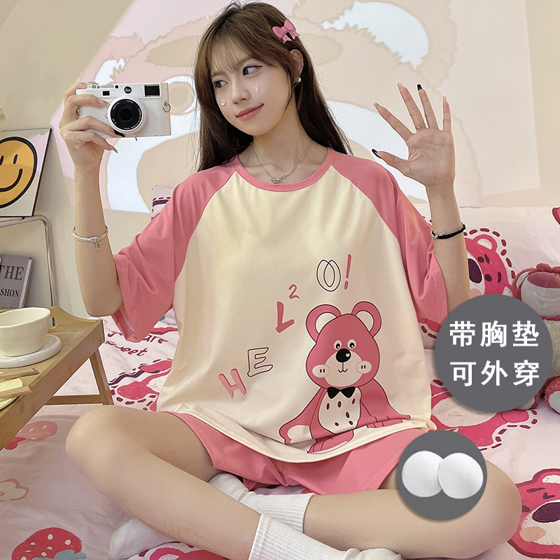 带胸垫睡衣女夏季短袖甜美睡衣女士大码加胸垫宽松卡通家居服女