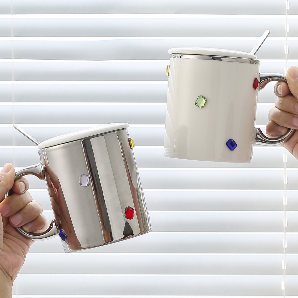 网红感小众电镀宝石马克杯高颜值创意陶瓷杯带盖勺家用情侣水杯