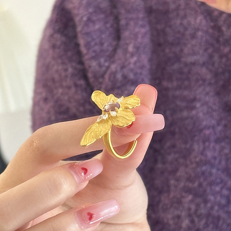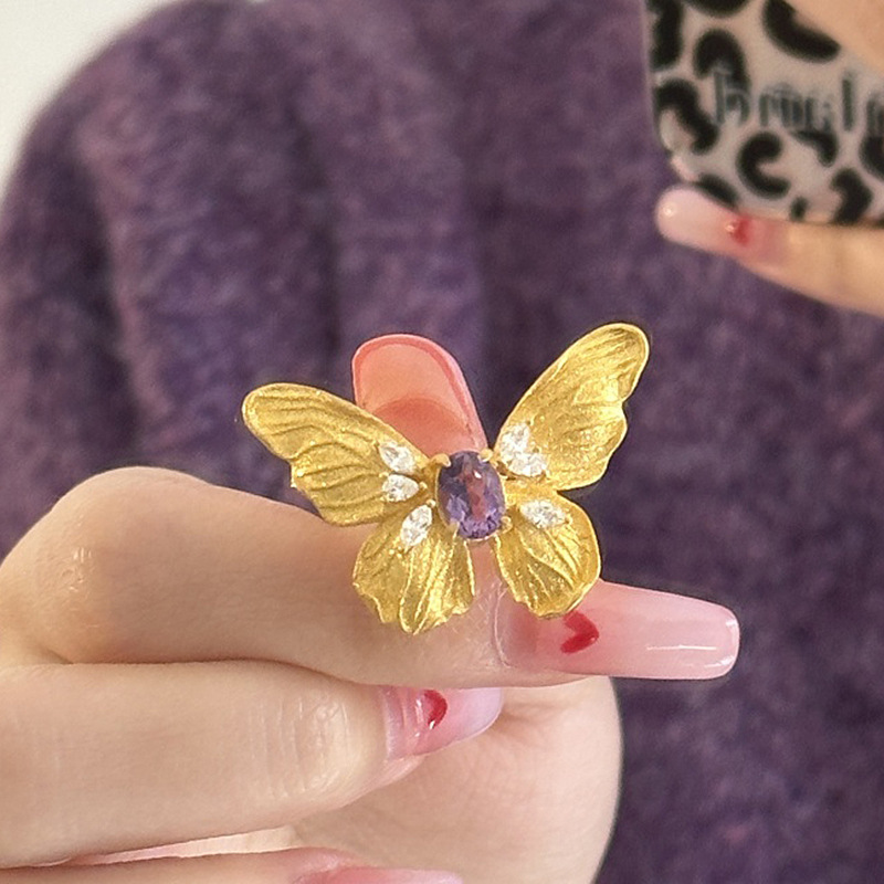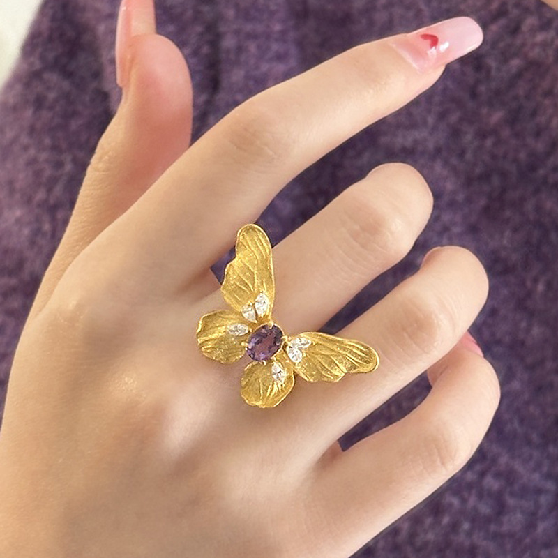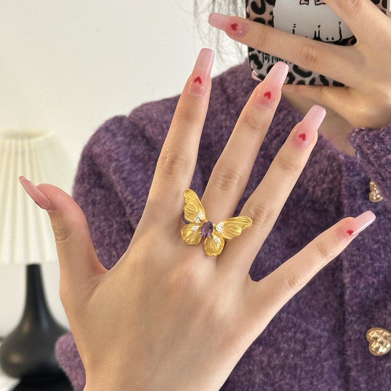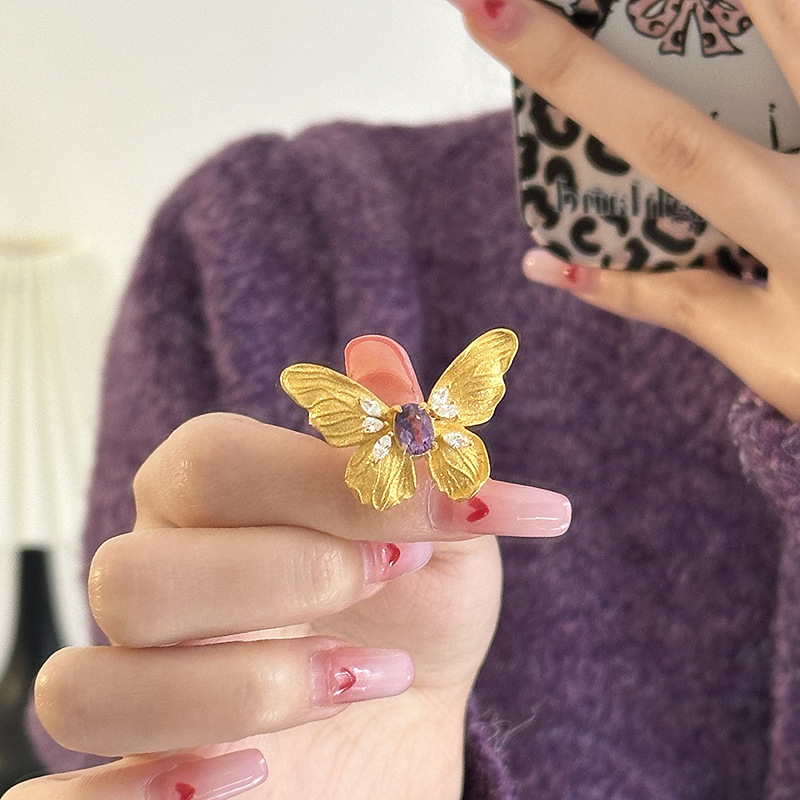 小红书爆款爆闪轻奢紫钻蝴蝶戒指古法Vintage复古紫宝鸽子蛋指环
