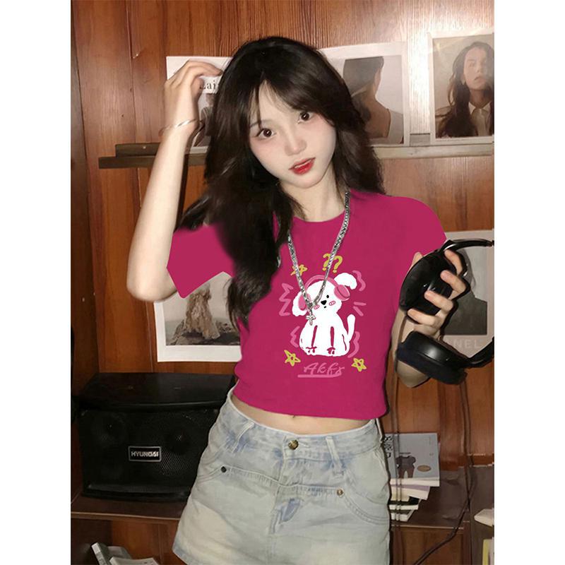 独特别致t恤短袖女小个子短款火龙果色多巴胺穿搭修身设计感上衣