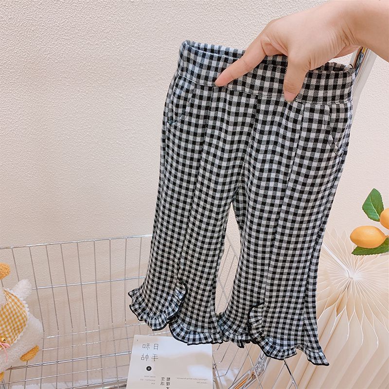 春秋女童装休闲裤宝宝洋气儿童个性潮韩版格子花边开叉网红喇叭裤