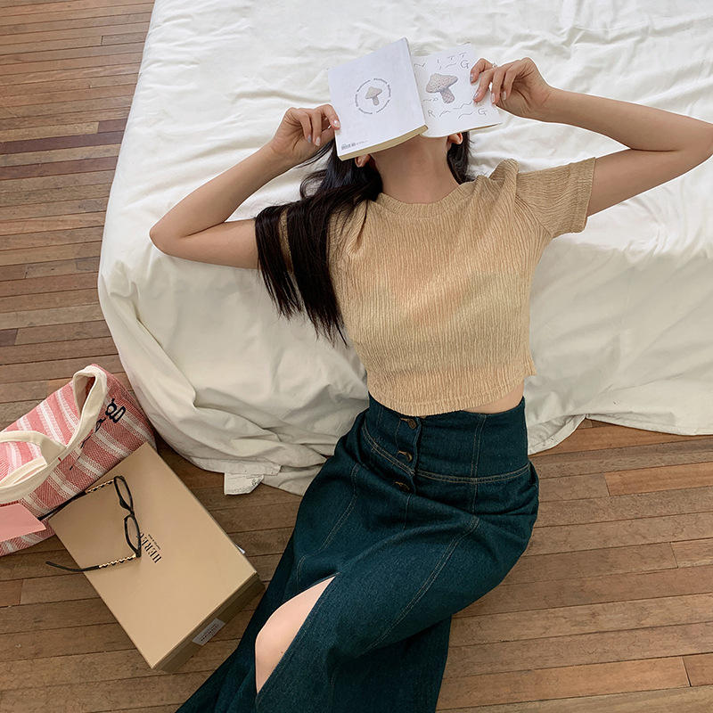 简约立体编织条纹短袖t恤女夏季高腰短款宽松休闲复古小衫上衣ins