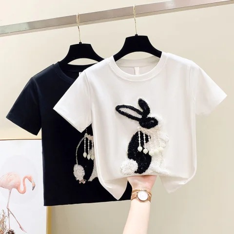 白色短袖t恤女夏季2025新款欧货小众别致刺绣T恤钉珠短款上衣夏装