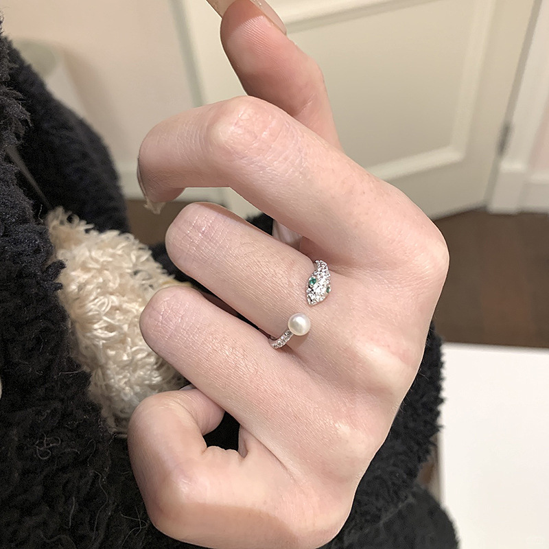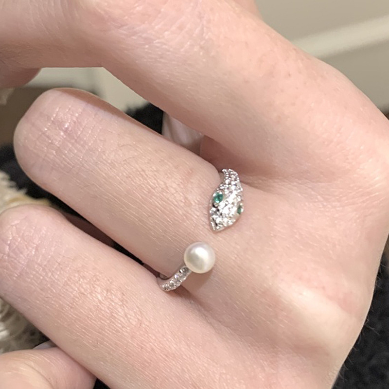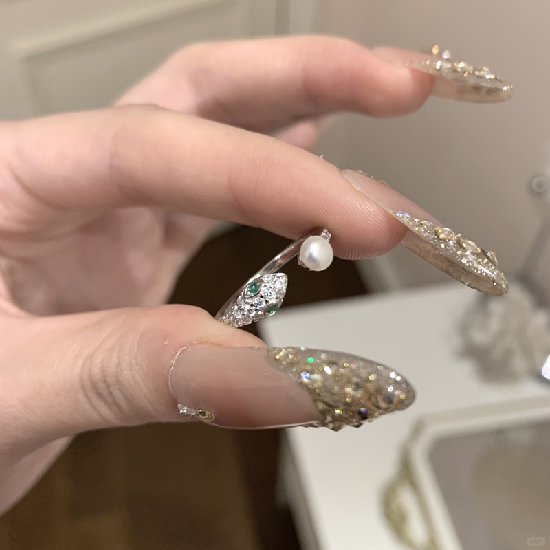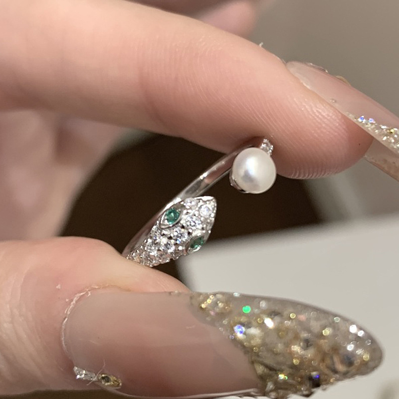 小红书爆款满钻爆闪蛇头珍珠戒指女时尚个性生肖灵蛇指环