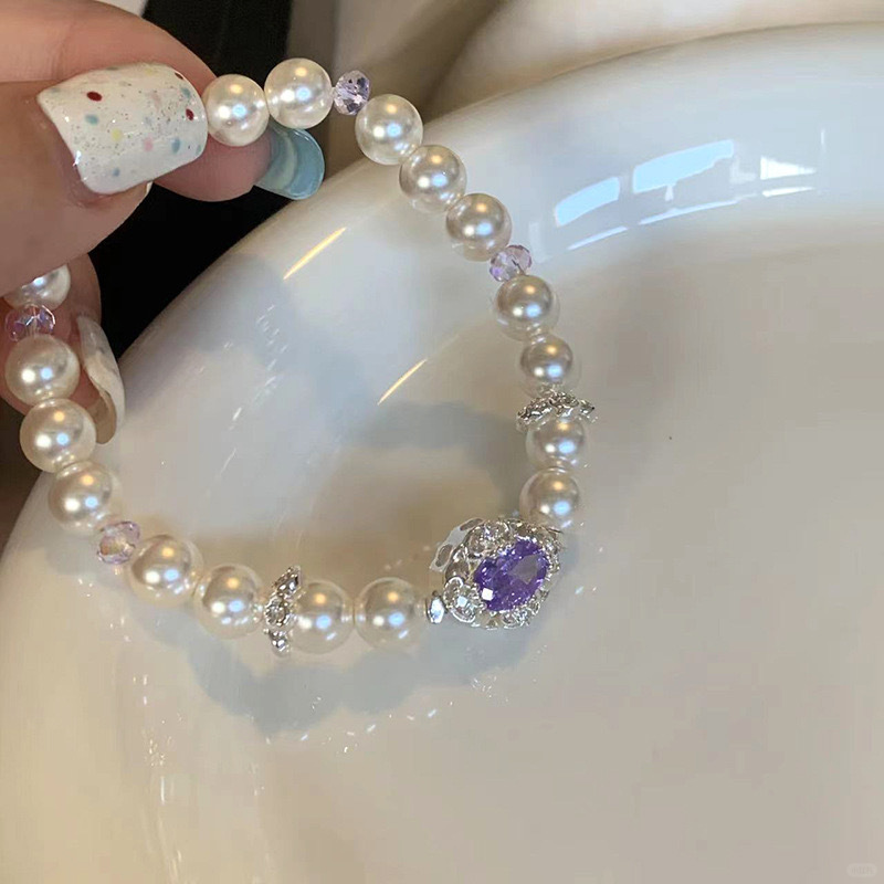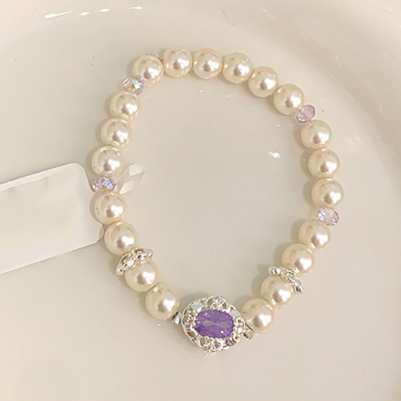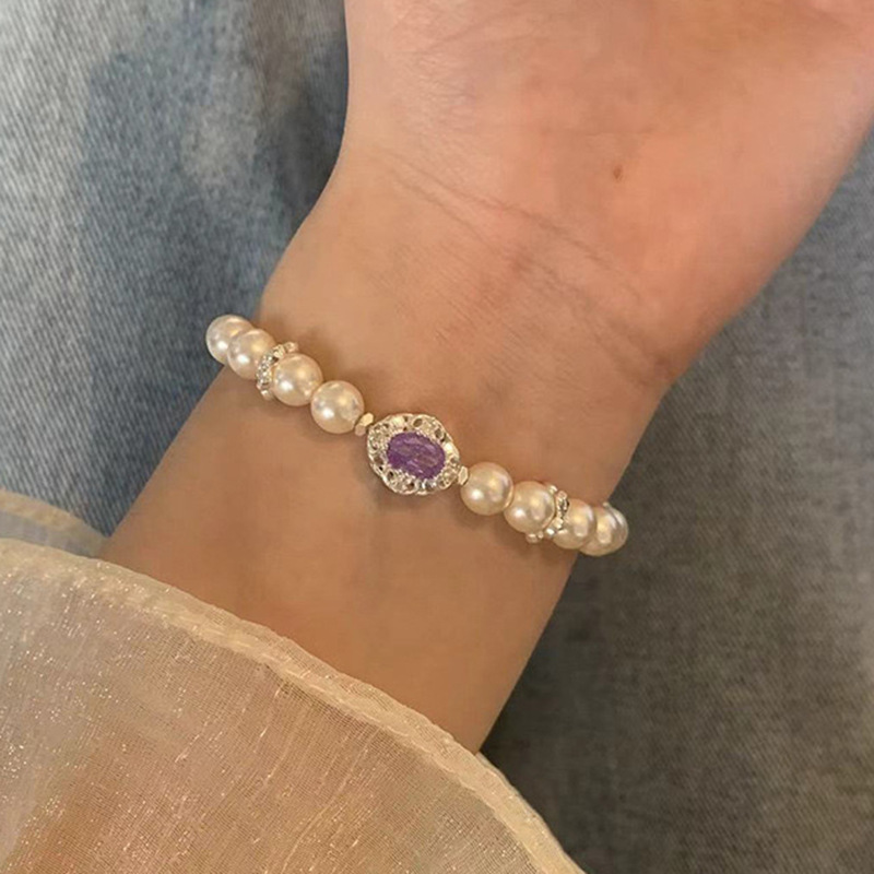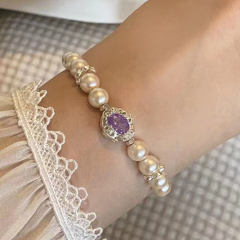 新款小众高级感珍珠串珠手链女椭圆型紫色锆石弹力绳手链
