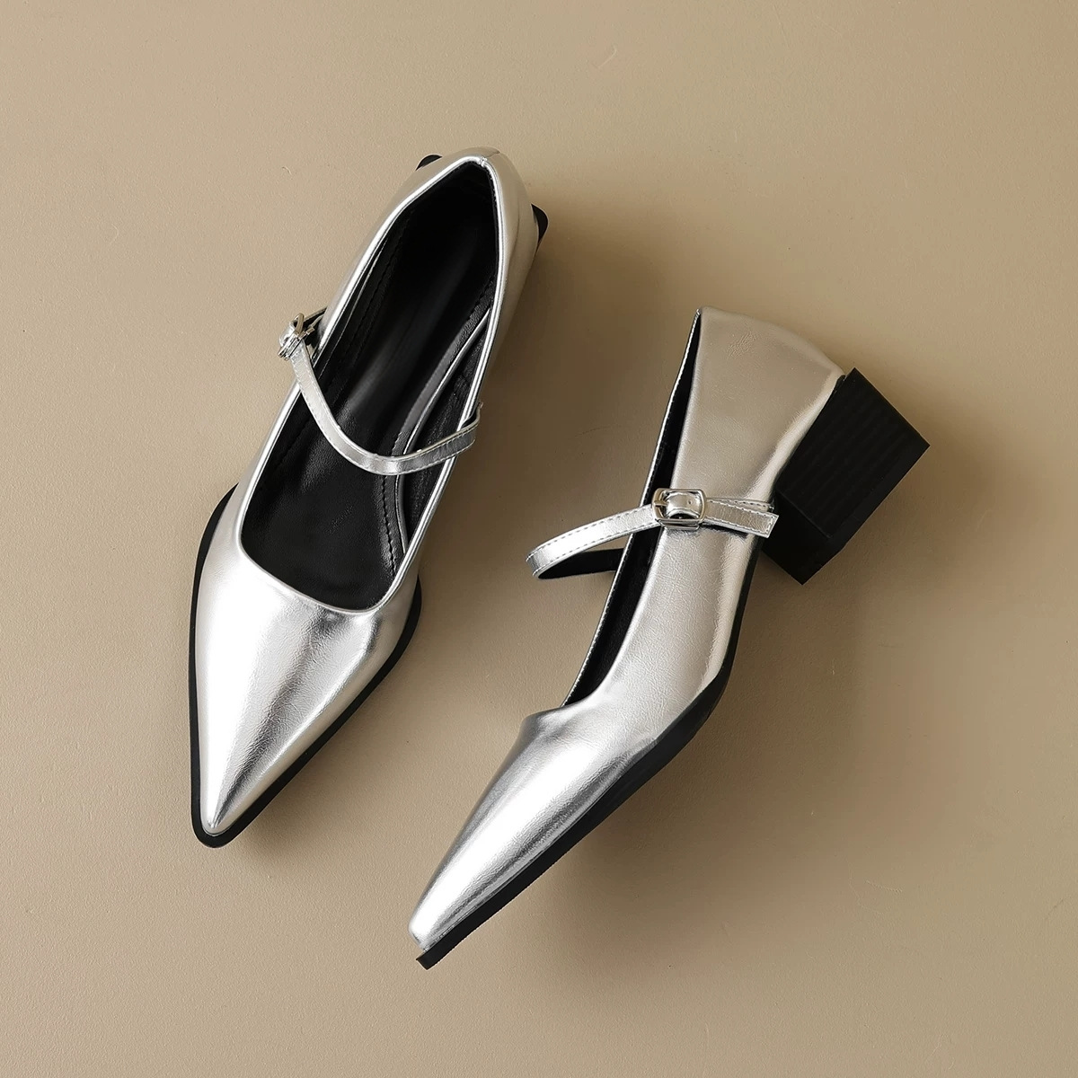 时尚百搭法式尖头玛丽珍鞋女新款粗跟单鞋黑色小皮鞋女