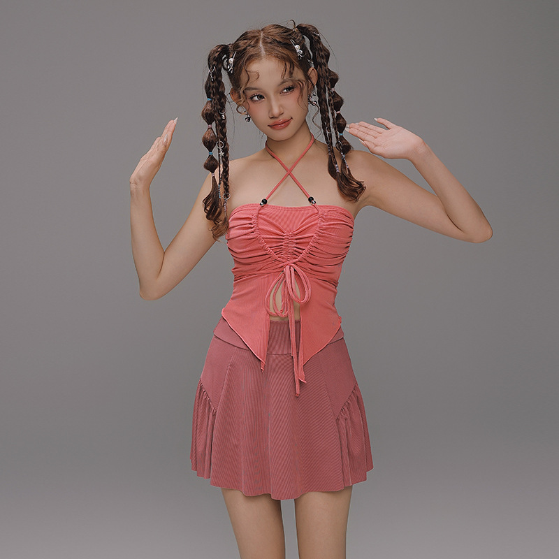 新款泳衣女法式小众辣妹露肩性感挂脖修身遮肚显瘦学生沙滩泳装