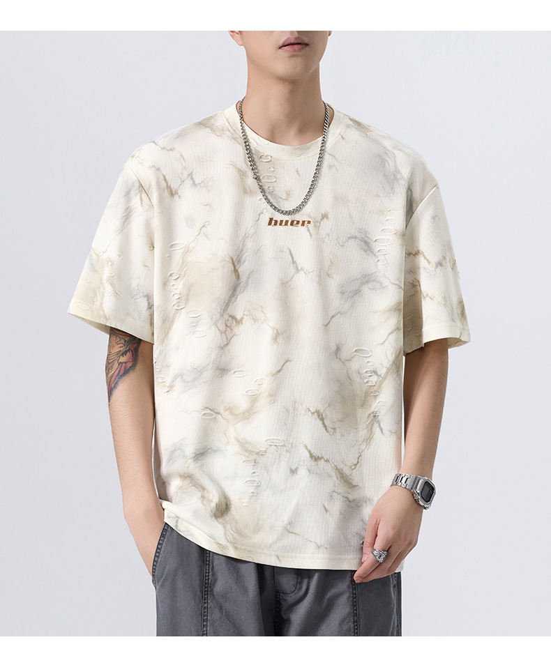 2025新款上衣潮牌薄款短袖T恤男宽松休闲夏季假破洞凉感半袖体恤