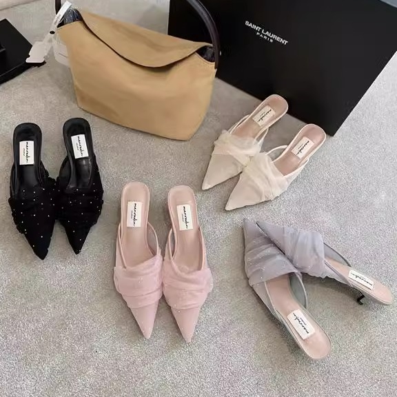 法式温柔尖头细跟包头拖女外穿2025年春季新款晚风网纱浅口凉拖鞋