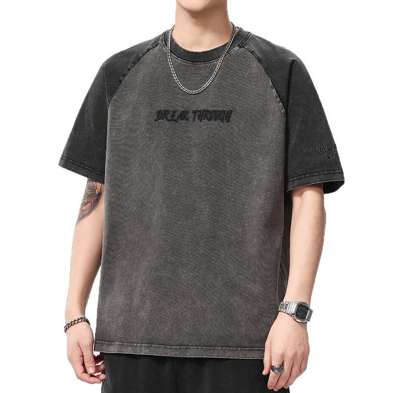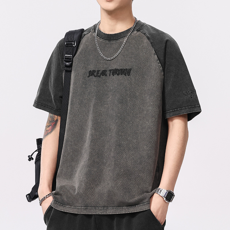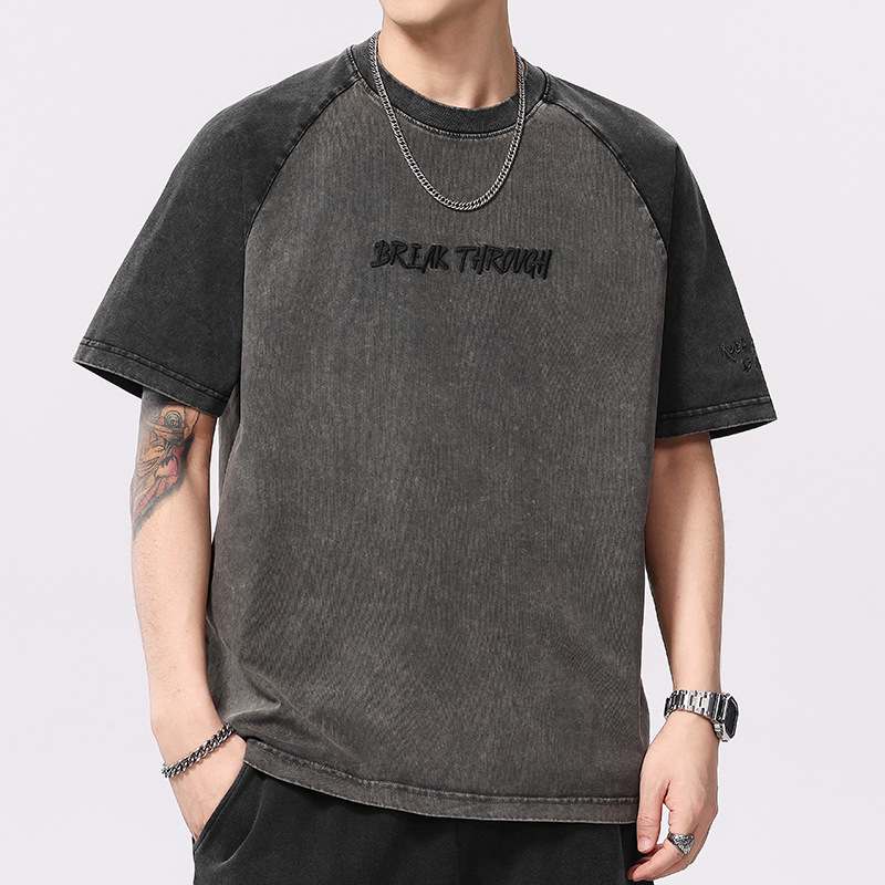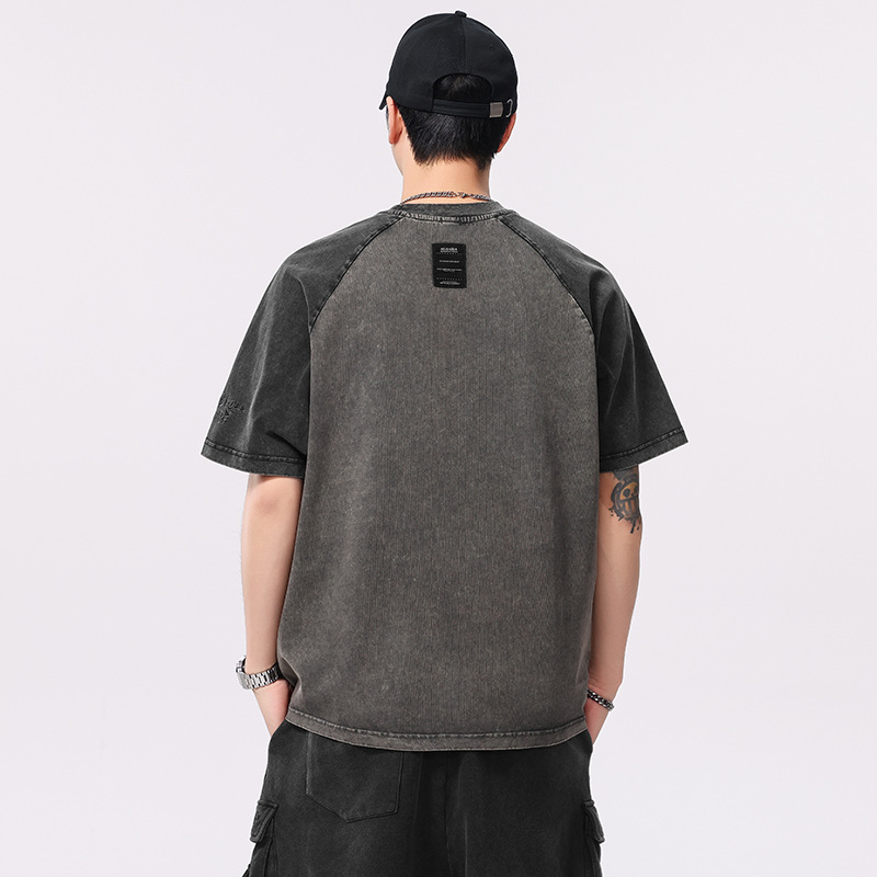 高端撞色插肩炒盐水洗短袖t恤男夏季美式复古刺绣宽松重磅体恤男