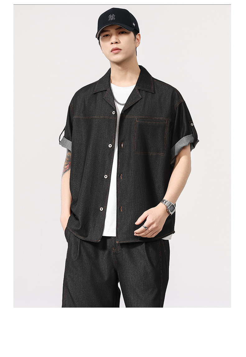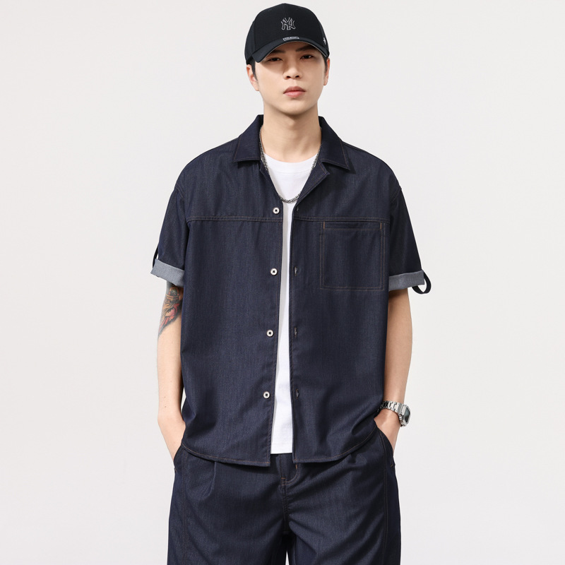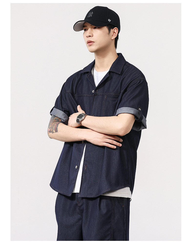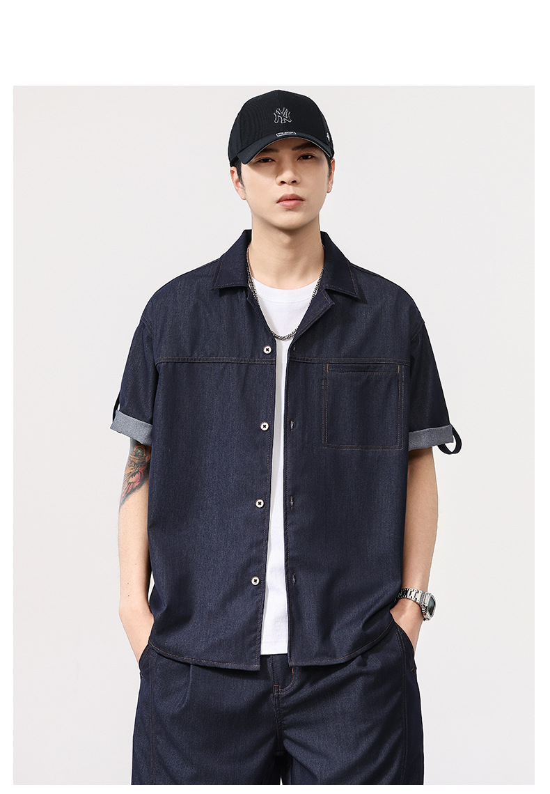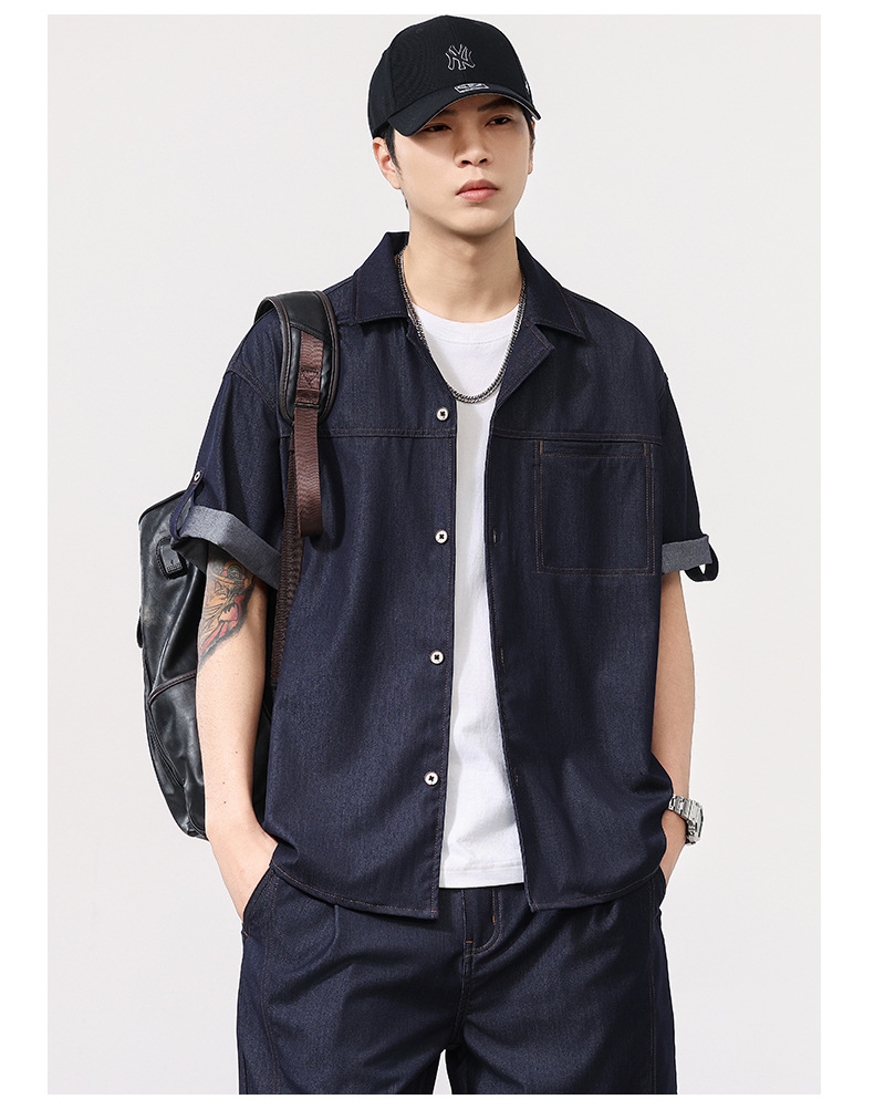 蓝色短袖衬衫男士夏季薄款复古水洗翻领高级感冰丝仿牛仔衬衣