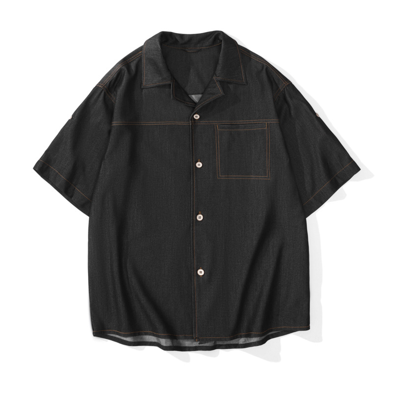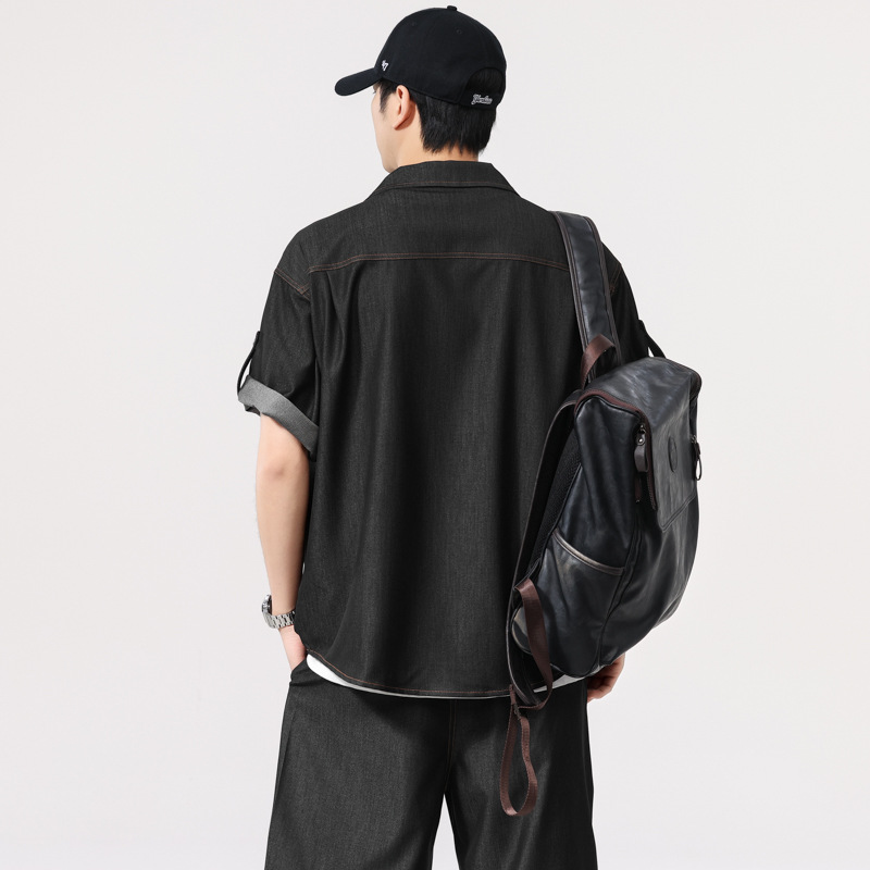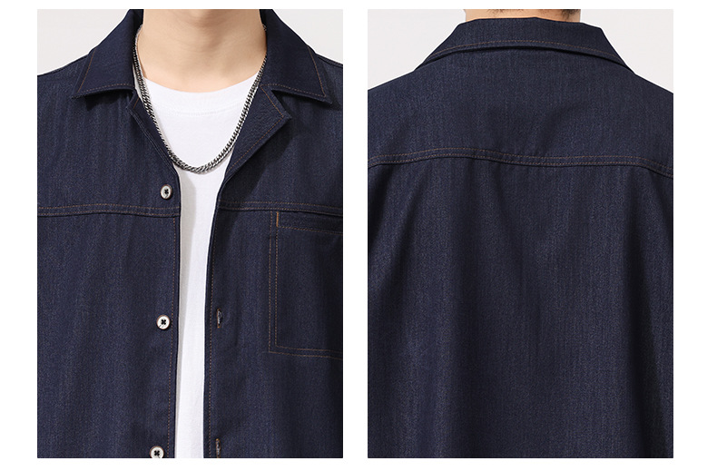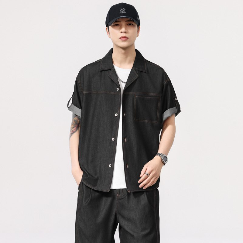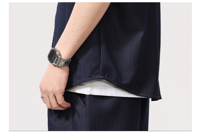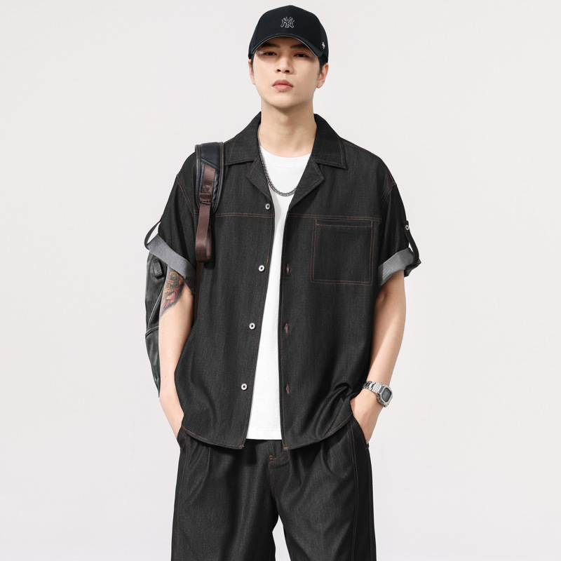 蓝色短袖衬衫男士夏季薄款复古水洗翻领高级感冰丝仿牛仔衬衣