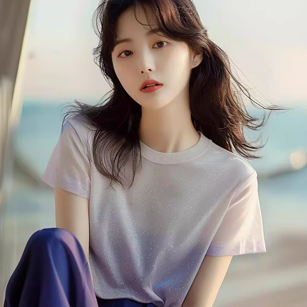 紫色渐变针织短袖t恤女夏季新款今年流行漂亮小衫亮闪闪上衣