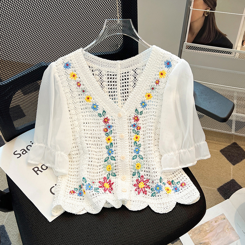 小清新短袖钩花针织短款上衣女拼接设计感小众夏薄款高腰雪纺t恤