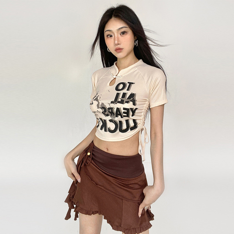 甜酷辣妹风新中式短袖T恤女夏季复古设计感印花正肩抽绳短款上衣