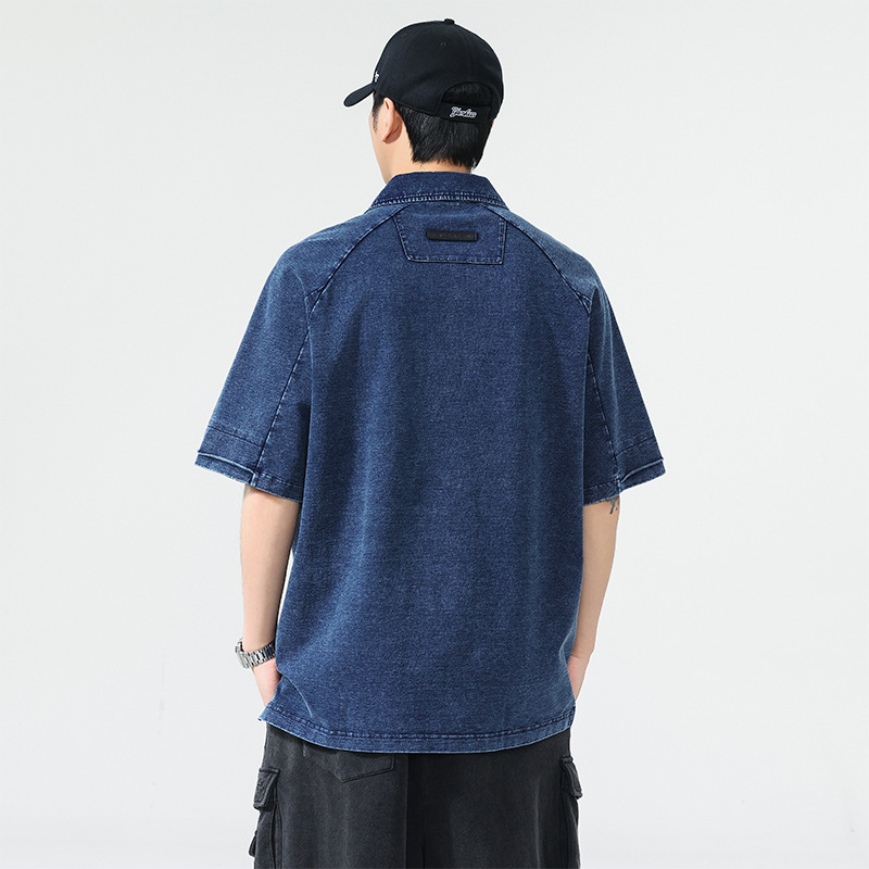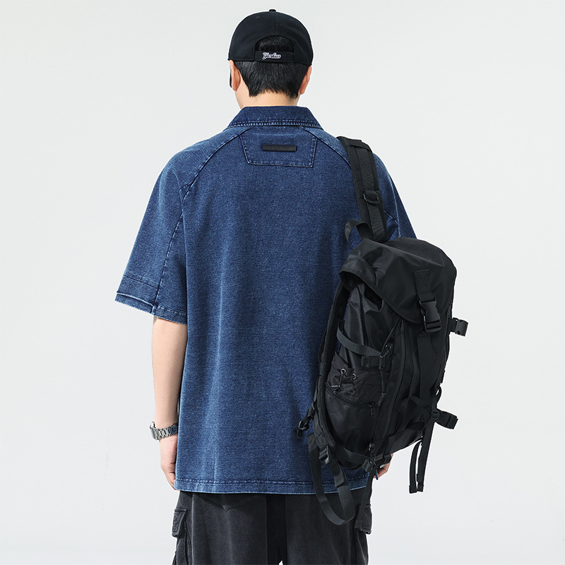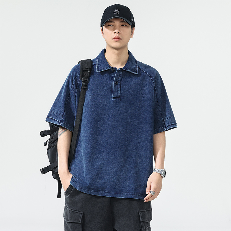 高端美式复古短袖牛仔Polo衫男夏季潮牌宽松大码透气休闲五分T恤