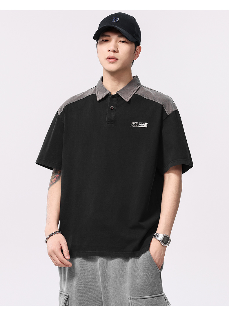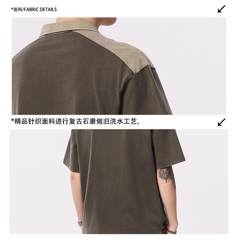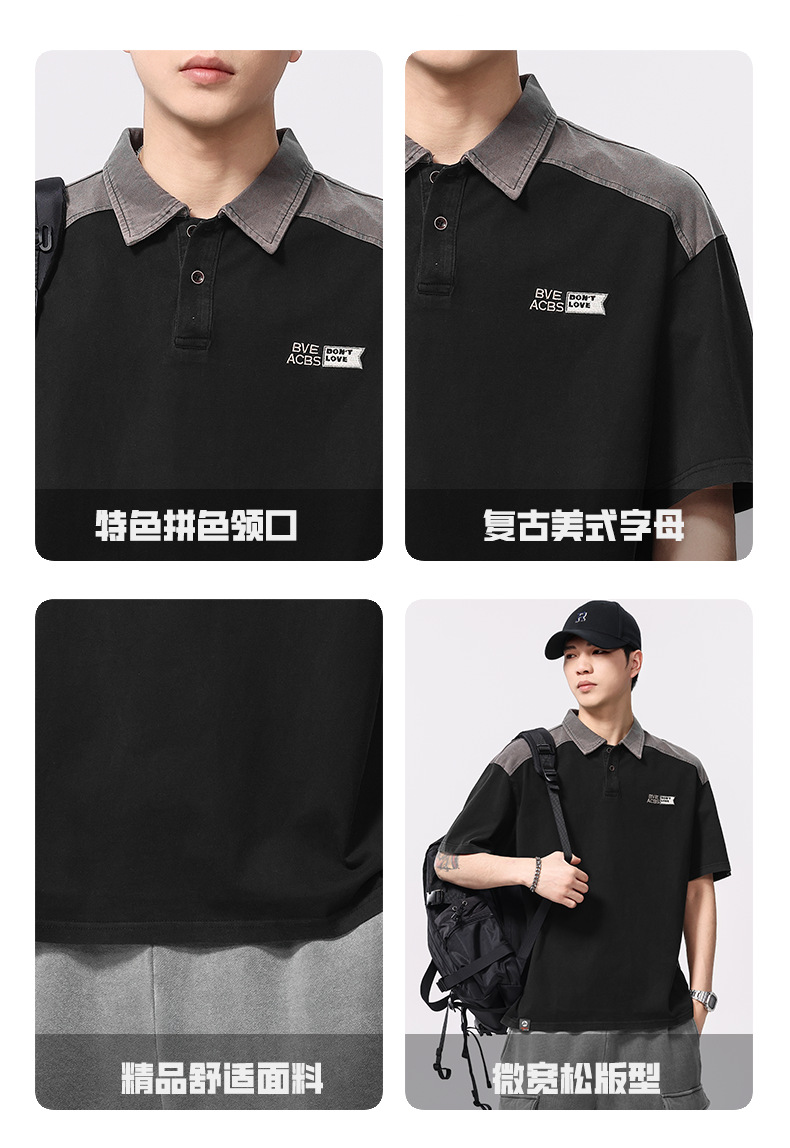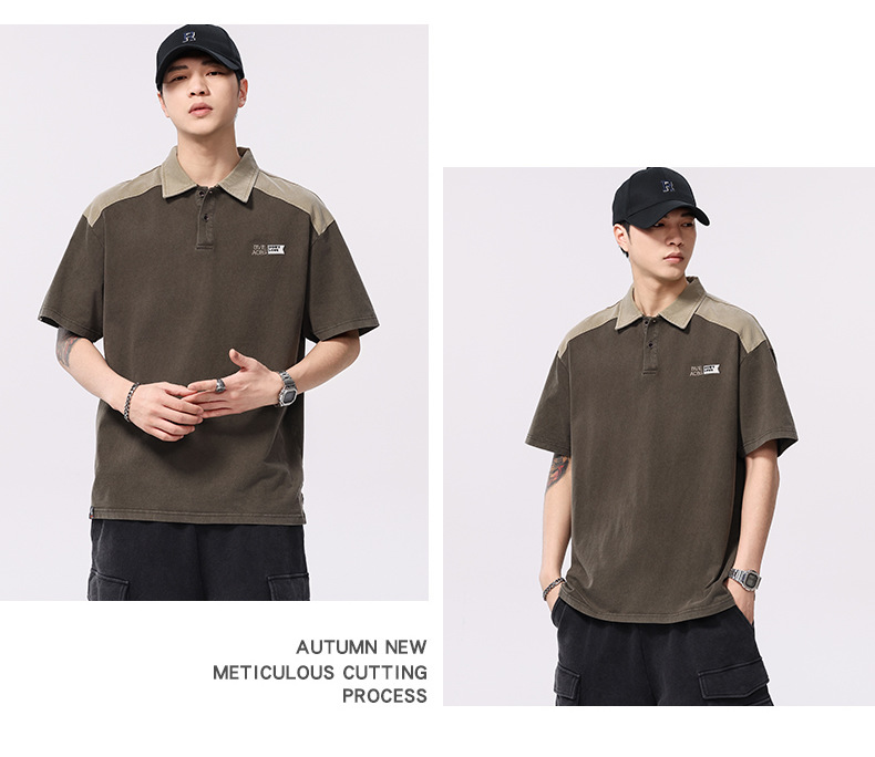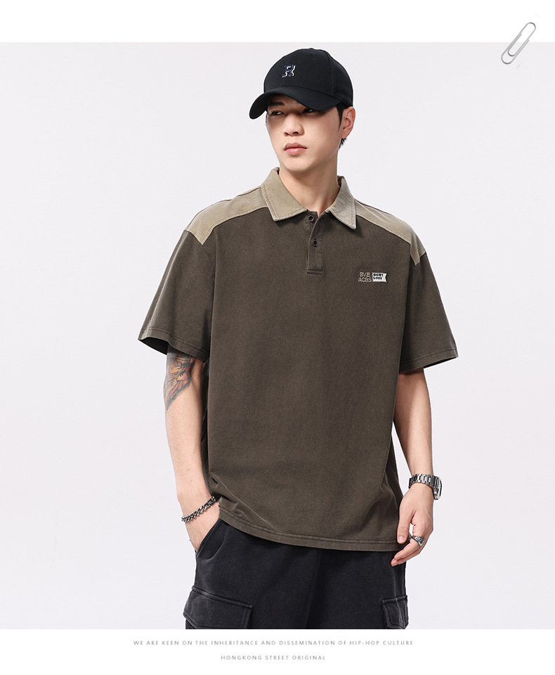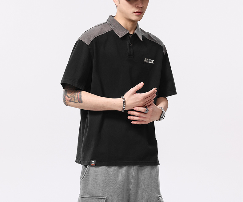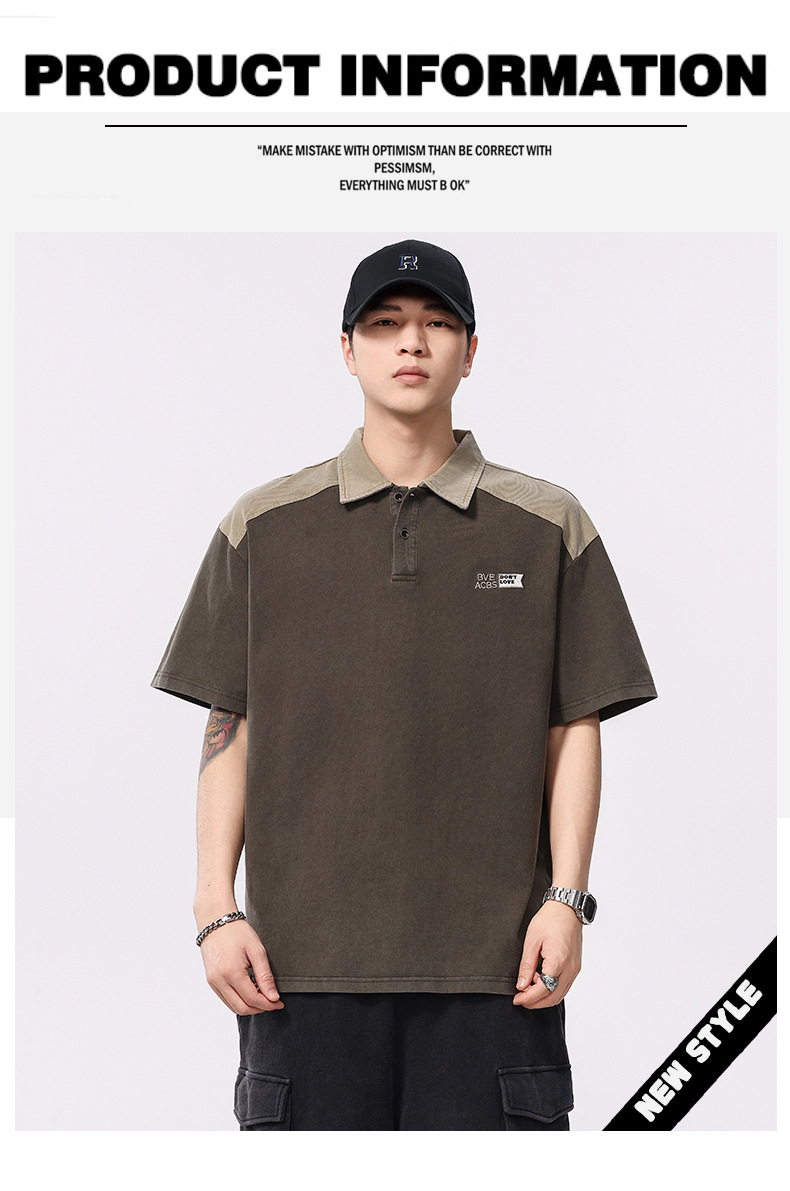 美式复古炒盐洗水短袖polo衫男夏季新款宽松大码潮牌拼接休闲半袖