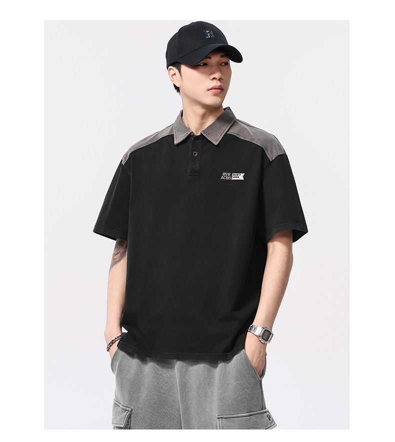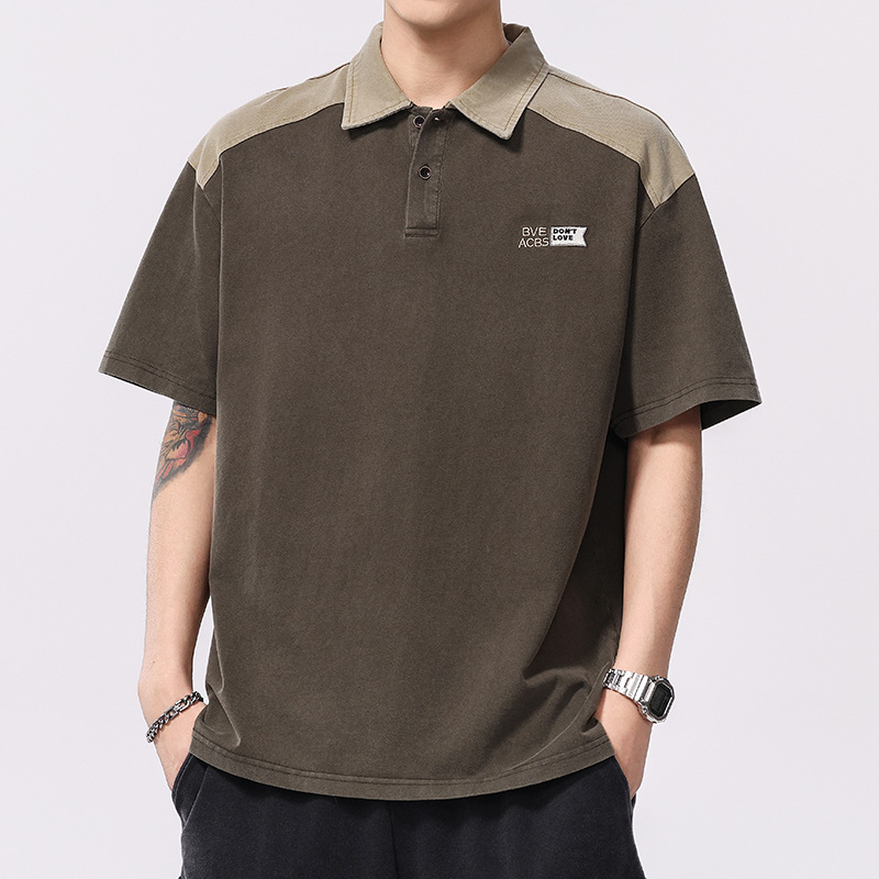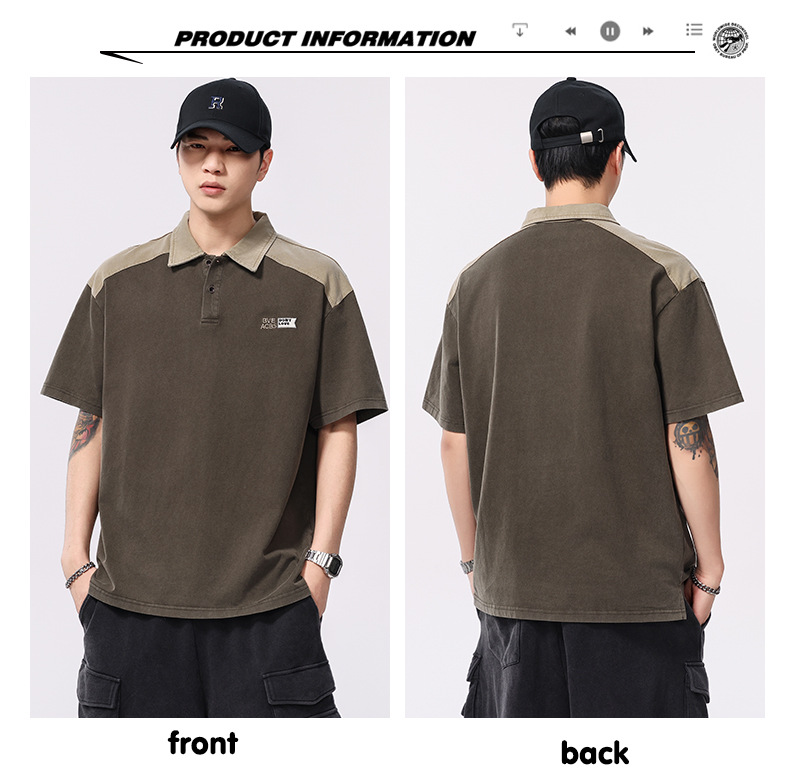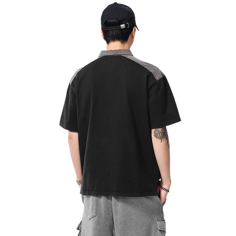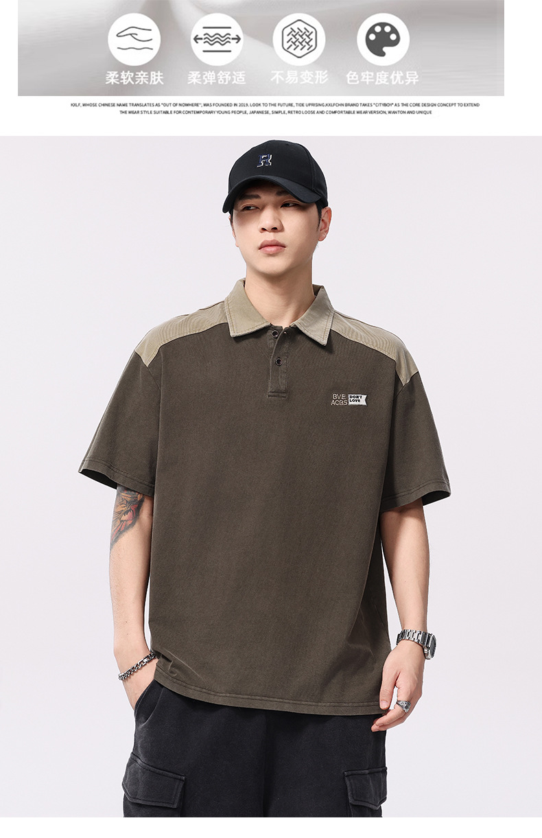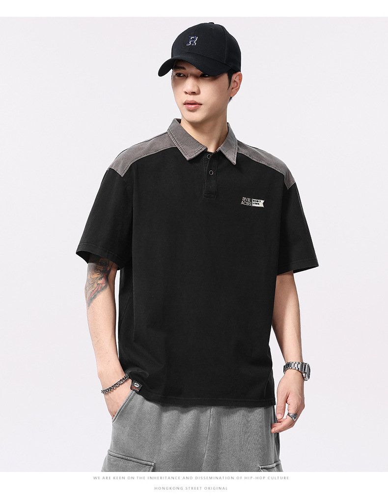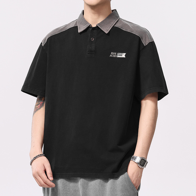 美式复古炒盐洗水短袖polo衫男夏季新款宽松大码潮牌拼接休闲半袖