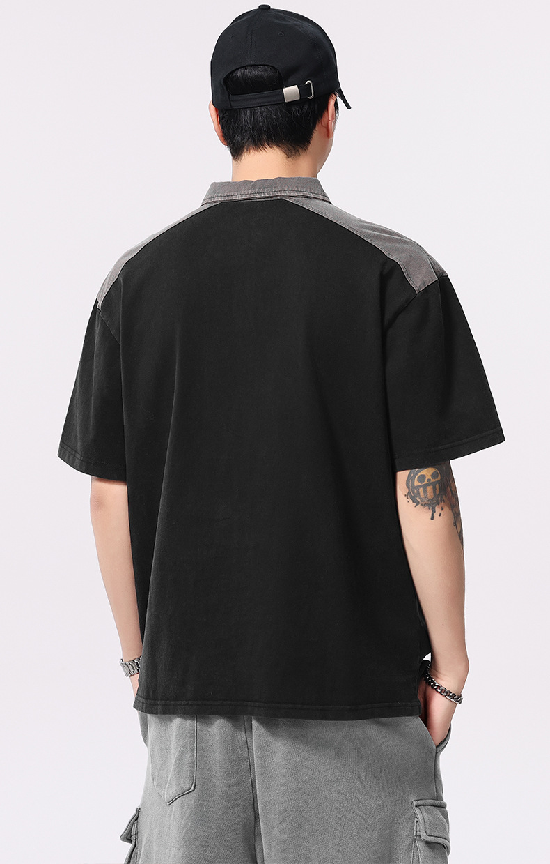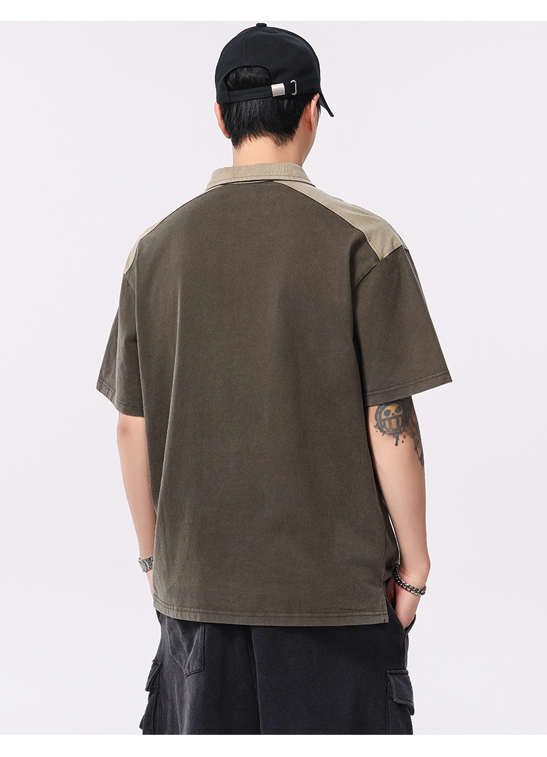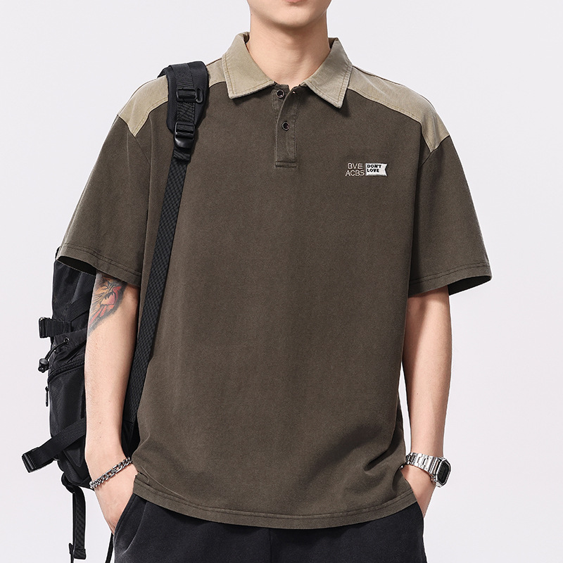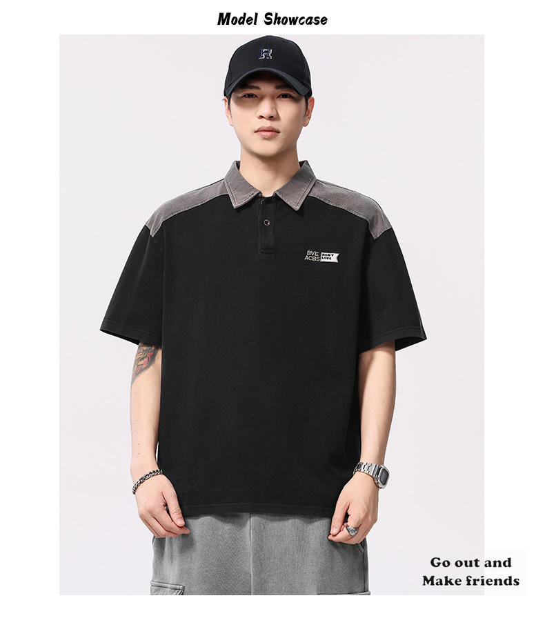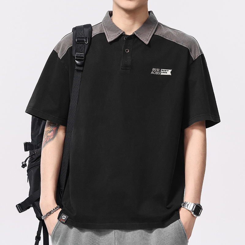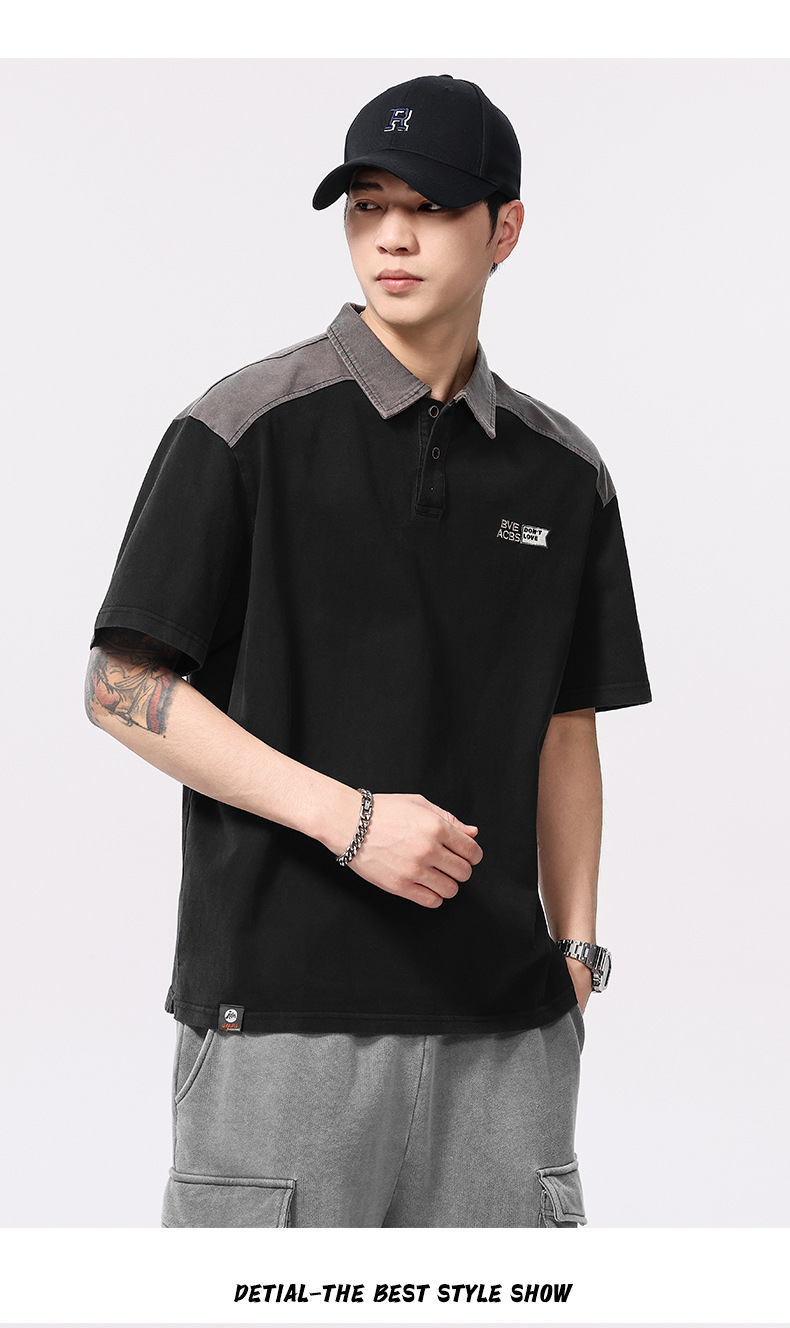 美式复古炒盐洗水短袖polo衫男夏季新款宽松大码潮牌拼接休闲半袖