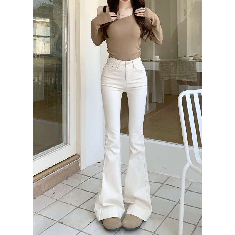 早秋新款纯欲性感辣妹百搭高腰显瘦白色微喇叭牛仔裤女